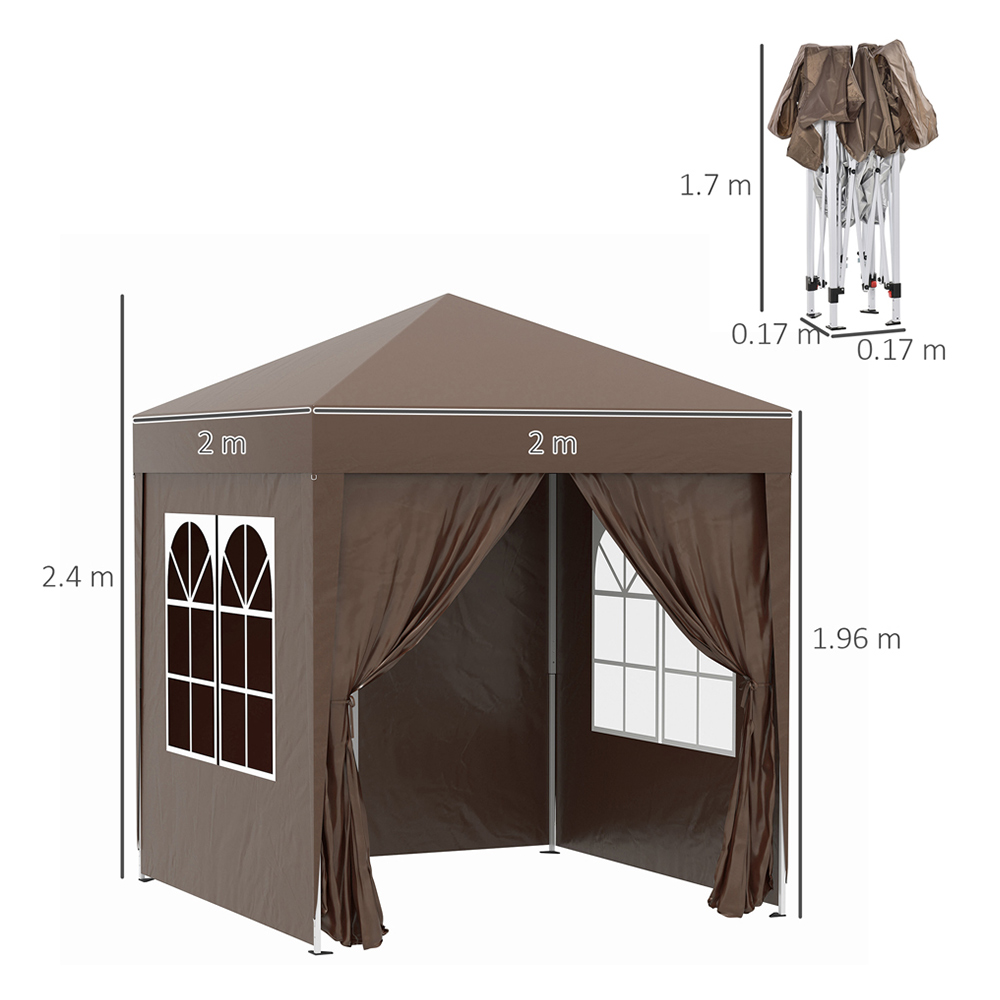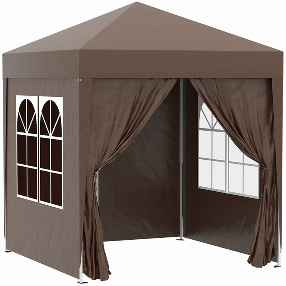 Perfect for outdoor gatherings, the Coffee Marquee Gazebo from Outsunny provides a convenient and stylish shelter solution. Whether it's family celebrations, wedding receptions, picnics, sporting events, outdoor vendors, craft fairs, job sites, or camping adventures, this gazebo is an ideal choice. Constructed with a robust, powder-coated steel frame, it's designed for strength and durability, even during the winter months. The durable, water-resistant Oxford canopy, complete with a silver coating, effectively blocks harmful rays and reduces heat build-up inside. This easy pop-up gazebo features four removable walls, offering flexibility and customisation. For added convenience, it includes a portable carry case, ropes, and stakes to ensure stability. Dimensions: 2 x 2m.