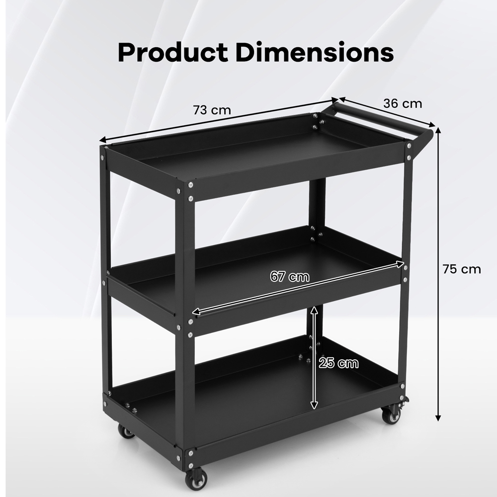 Maximise your efficiency with the Costway 3 Shelf Black Rolling Service Trolley, a flexible solution for workshops, kitchens and offices. This durable trolley boasts three generous shelves, offering plentiful storage to keep tools and supplies organised and within easy reach. Constructed with a high-strength metal frame, it supports a substantial load capacity of up to 120 kg. The four universal wheels, two of which feature brakes, ensure smooth and secure movement across different floor types. Practical features include a convenient handle for hanging towels and raised shelf edges to prevent items from slipping off, enhancing its overall usability.