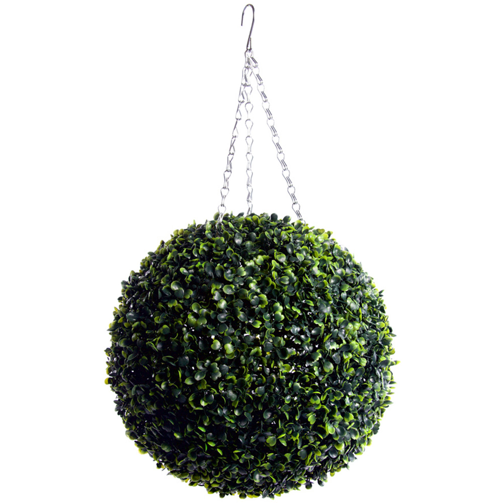 Transform your décor with the 35cm Artificial Green Boxwood Hanging Topiary Ball. This lush, realistic topiary boasts UV and weather resistance, requiring zero upkeep. Its dense leaf coverage creates an authentic look, while a durable galvanised chain and strong plastic frame ensure lasting outdoor performance. Enjoy effortless beauty anywhere.