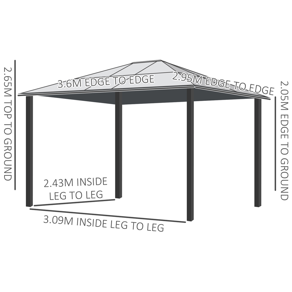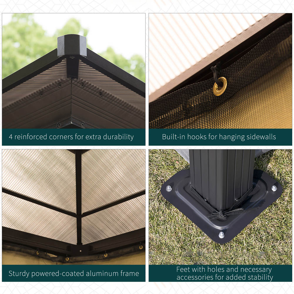 Add an elegant touch to any outdoor space with this Outsunny 3.6 x 3m Brown Aluminium Frame Gazebo. This tent with netting is the perfect shelter for all your occasions. It comes with a polycarbonate roof that is UV-protective and blocks harmful sunrays to offer ultimate protection. Apart from this, the rust-resistant aluminium frame makes it sturdy and spacious to host plenty of people at once. Cosy and protected, the gazebo comes with curtains, each with inner netting to shield you from annoying bugs and create privacy. Size: 3.6 x 3m.