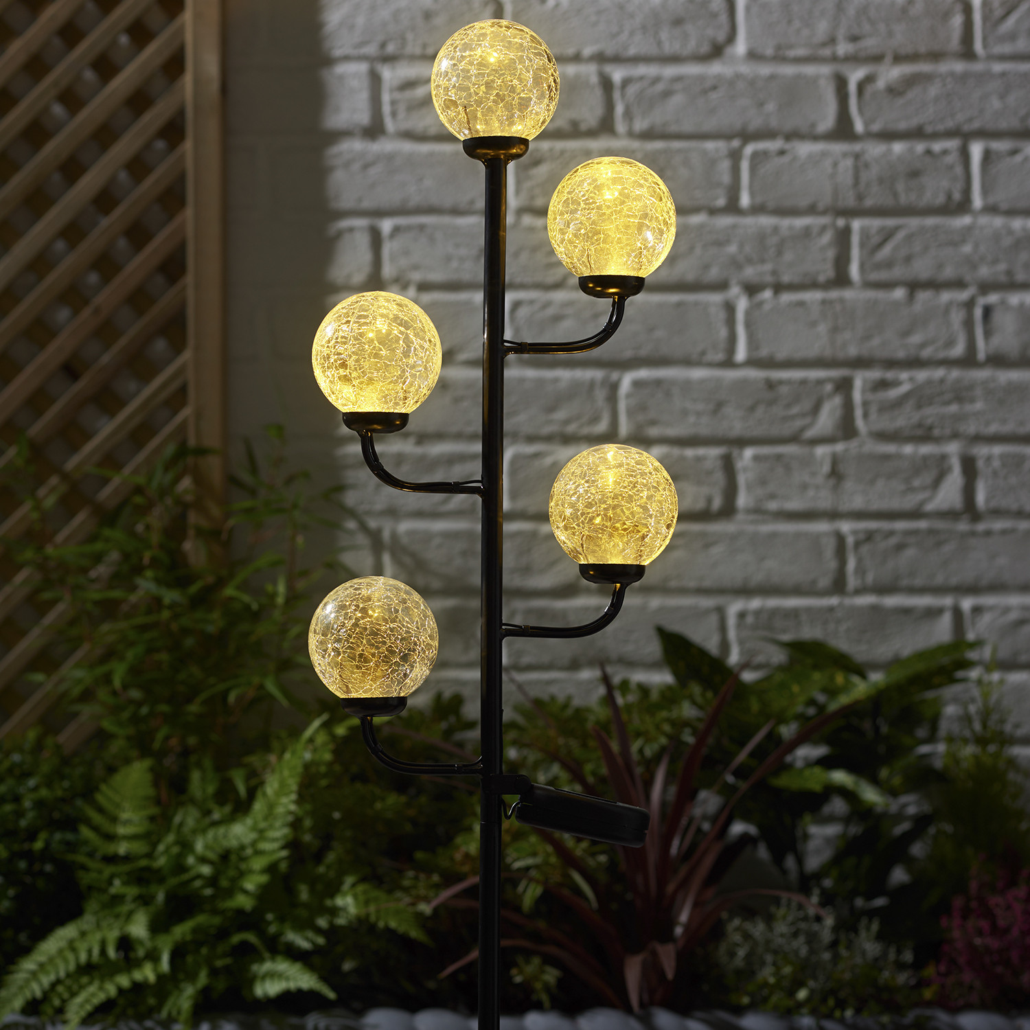 Illuminate your garden with the captivating Solar Crackle Ball Stake Light. This striking light, standing at over 80cm tall, features five branches adorned with crystallised crackle balls. A built-in solar panel powers the warm white glow emitted at dusk, creating a magical ambiance. Perfect for defining pathways or enhancing doorways, this light adds a touch of drama and elegance to any outdoor space.
