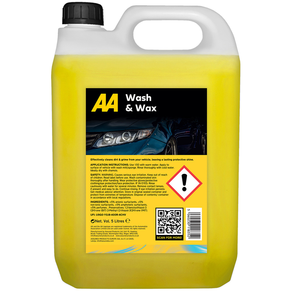 Keep your vehicle spotless with this efficient AA 5L Wash and Wax Car Shampoo with Cockpit Shine 750ml. Ideal for both exterior and interior care, it not only maintains the cleanliness of your car's exterior but also brings a showroom shine to the dashboard and surrounding areas. This biodegradable car shampoo works hard to protect and clean.