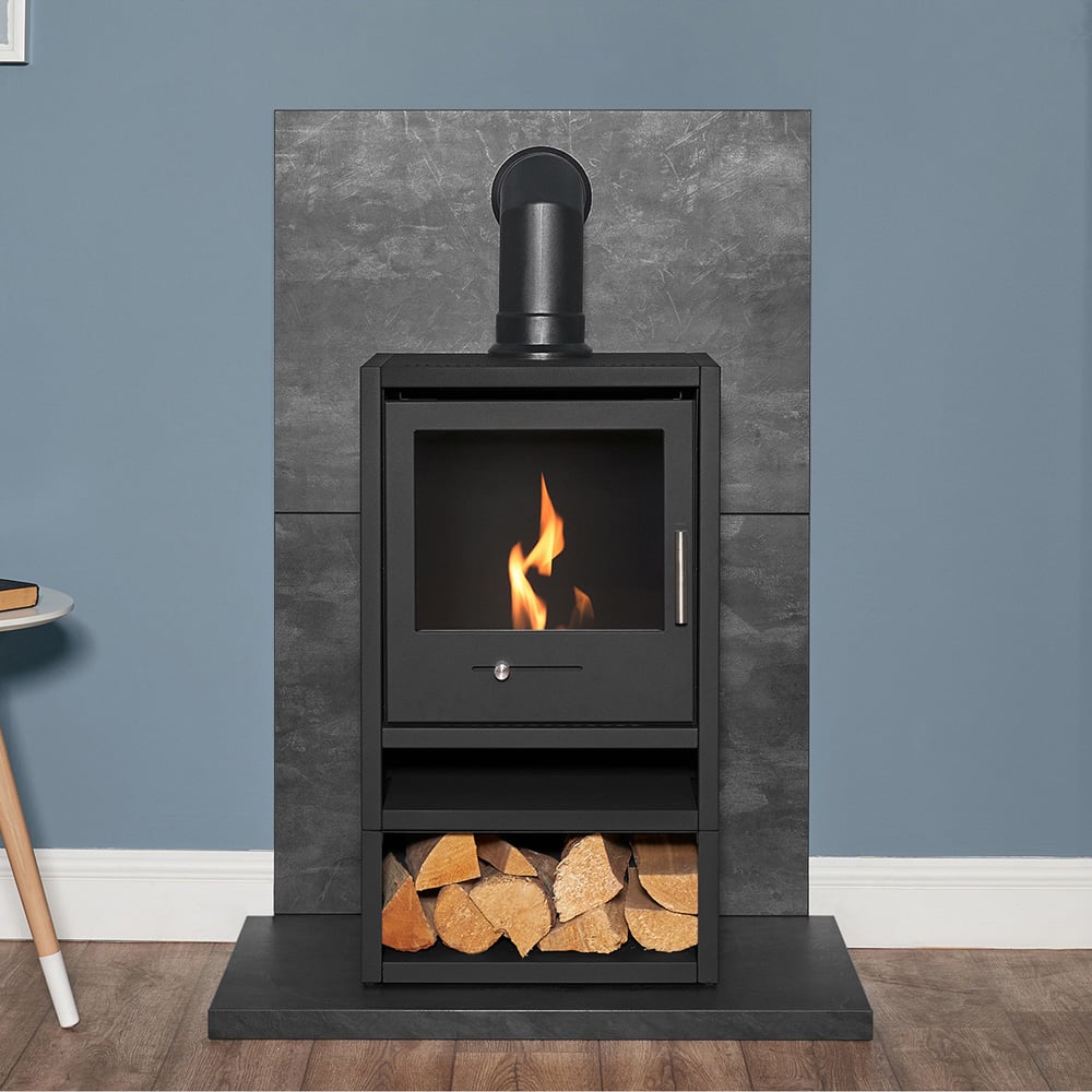 Acantha Slate Venetian Plaster Effect Tile and Hearth Set with OKO S1 Stove Log Store