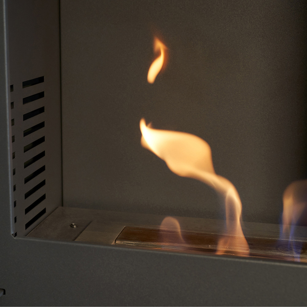 Create a stunning focal point with this Acantha set. This package includes three tiles and a hearth, all finished in a sophisticated slate Venetian plaster effect. A charcoal grey bioethanol stove and a tall, angled stove pipe complete the look. The stove boasts a captivating real flame effect, enhanced by an airflow convection system that delivers warmth for up to eight hours, thanks to its 1.5L stainless steel bioethanol burner. Enjoy heat output up to 3kW, easily adjustable using the included control tool to suit your needs and the size of the opening. The modern glass-fronted stove features a 90-degree turning handle for convenient door operation.