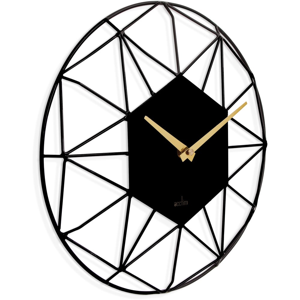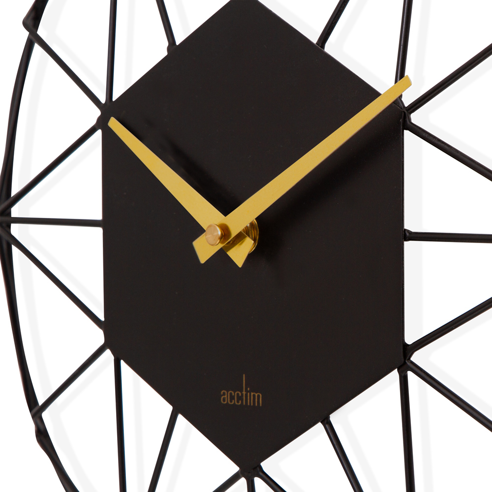 The Acctim Alva Black Metal Wire Clock, a 30cm statement piece for your home, seamlessly blends geometric design with versatile style. Its painted wire case encloses an open dial with quartz movement. A sophisticated brass scissor hand completes the look, making this clock an elegant addition to any interior.