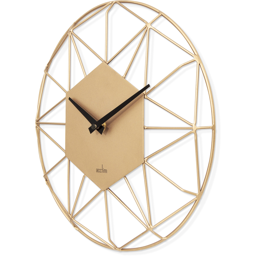 Elevate your home's aesthetic with the Acctim Alva Gold Metal Wire Clock, a 30cm statement piece. Its geometric design complements any interior. The painted wire case supports an open dial with quartz movement and a classy brass scissor hand. This elegant clock is the perfect finishing touch for your décor.