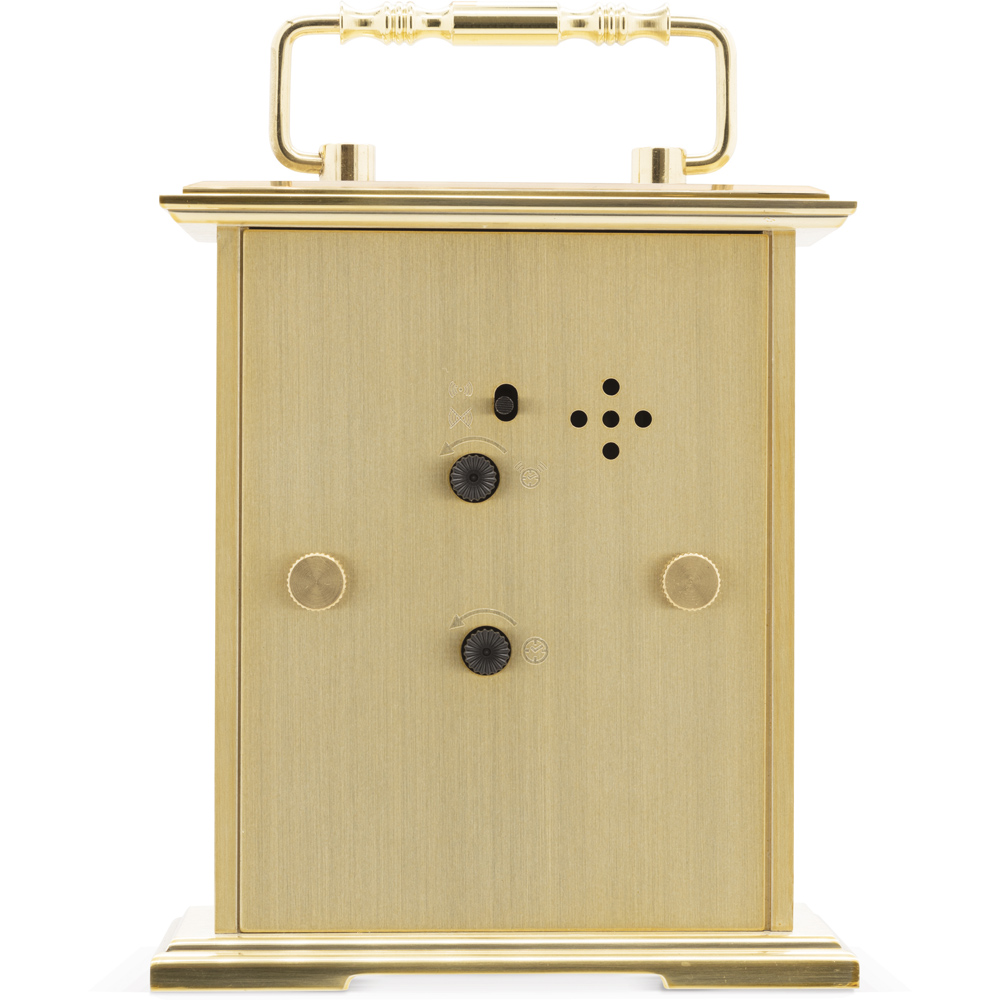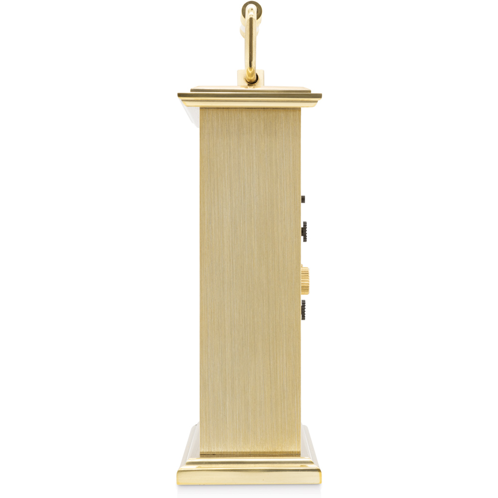 The Acctim Gainsborough Gold Carriage Clock, a 15cm statement piece, brings classic elegance to any setting. Its traditional Roman dial, driven by quartz movement and highlighted by decorative hands, resides within a polished silver metal case and handle top. A glass lens protects the face. This carriage clock also includes an alarm function with a minute marker track.