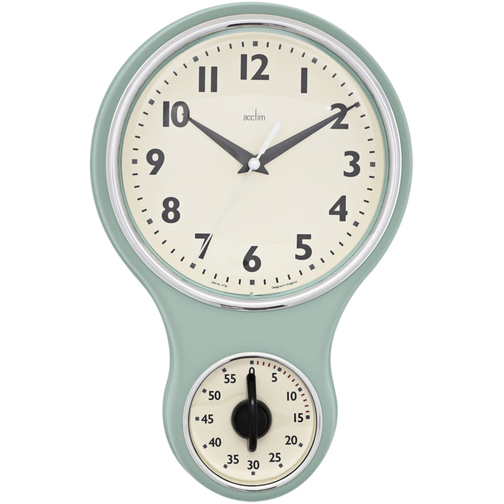 This stylish 30cm kitchen clock and timer brings retro charm to any room. Its sage green plastic case houses a quartz movement dial with clear black numbers and hands, offering easy readability. A convenient one-hour mechanical timer is built-in, and a protective domed glass lens ensures durability. A perfect addition to your home décor.