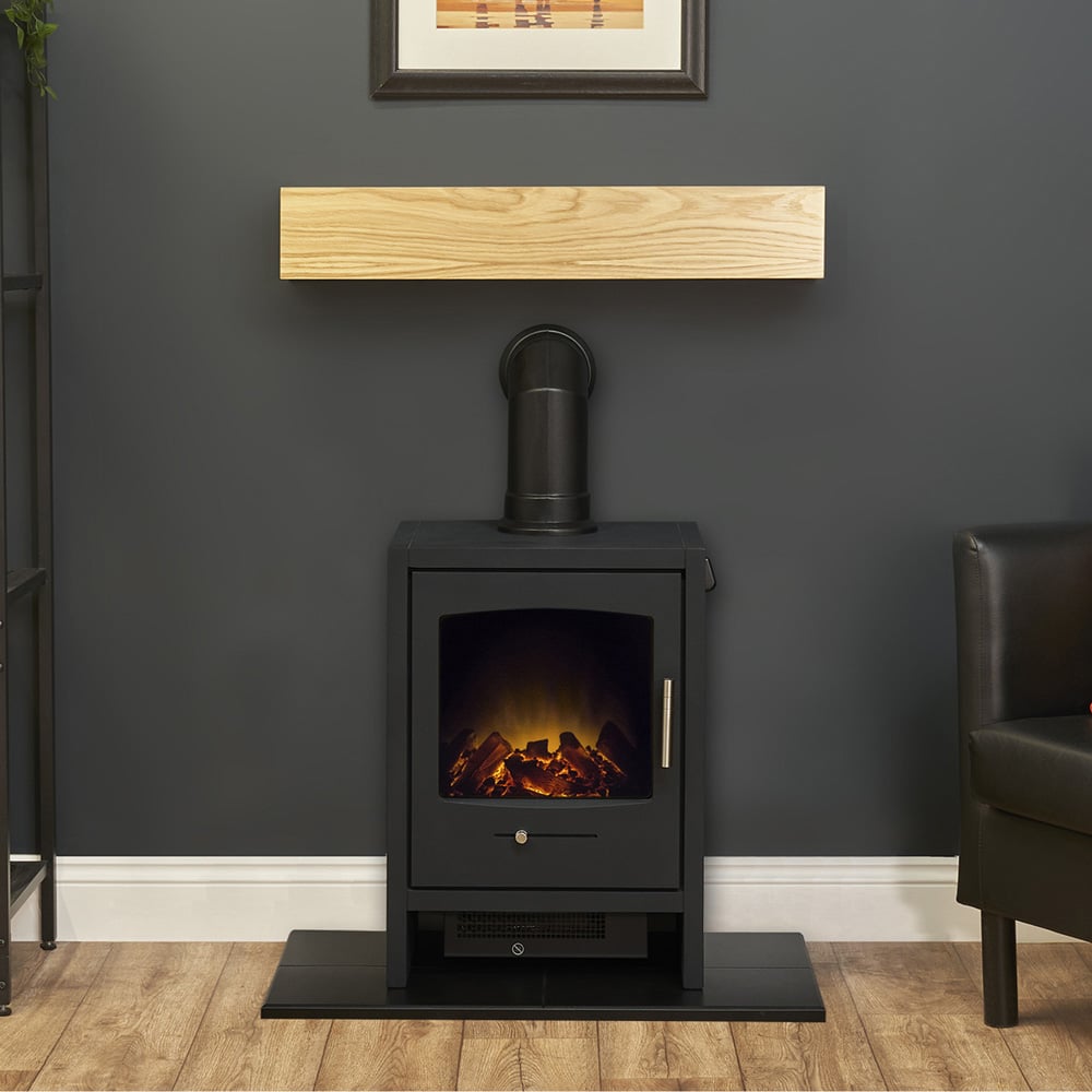 Create a stunning focal point with this complete set. Featuring an oak-effect beam and a black grooved wooden hearth, it’s finished with a stylish angled black stove pipe. The set is complemented by a charcoal grey electric stove, boasting a captivating log-effect fuel bed and realistic LED flame effect. Enjoy adjustable warmth with a heat output ranging from 0.9kW to 1.8kW.