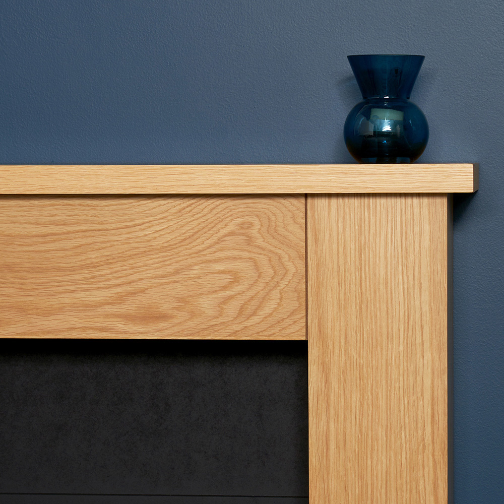 Make a statement with the Chester – a modern fireplace suite designed to become the heart of your living space. Its oak surround beautifully complements the black back panel and hearth. Wall-hugging design means no recess is needed, and it’s perfectly paired with the Sureflame Ripon electric stove and a straight stove pipe. The Ripon boasts a lifelike LED flame effect and coal effect fuel bed, delivering adjustable warmth from 0.9kW to 1.8kW. Control is simple, using the handy side dial and thermostat.