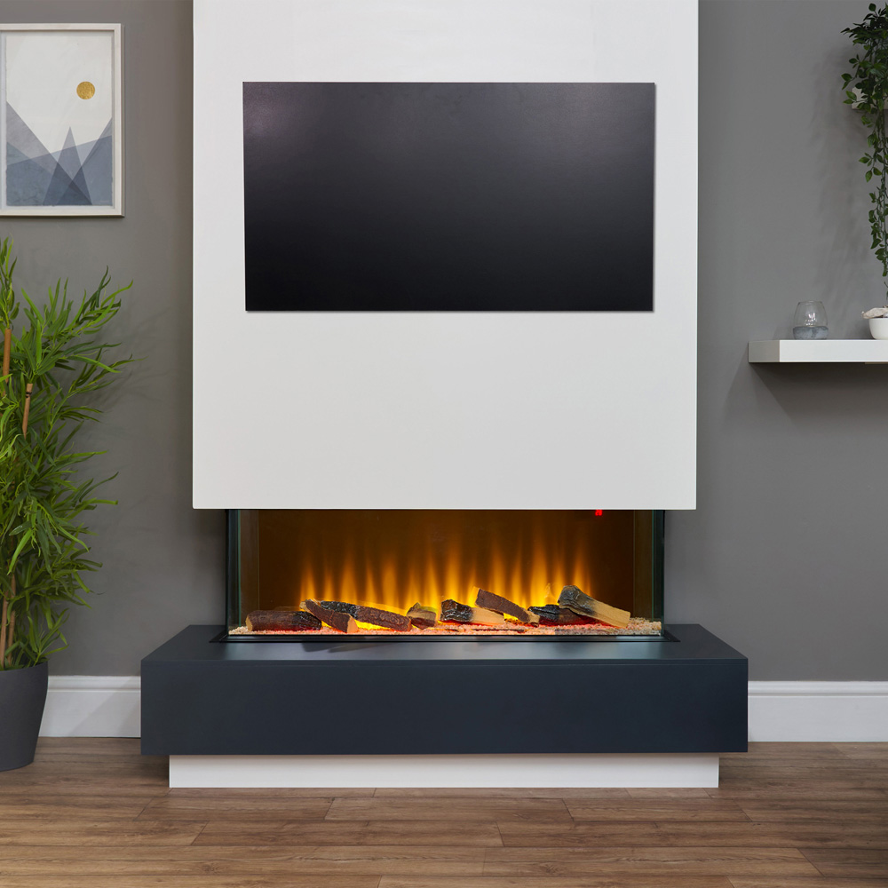 Create a captivating focal point with the Adam Sahara panoramic electric fire. Its atmospheric log fuel bed, 3D LED flame effect, and seven colour settings will transform your room. Enjoy heat outputs of 1kW and 2kW, easily controlled via the included remote, featuring a seven-day programmable timer. The remote also manages flame effects and colour choices. Unique three-sided glass panels offer flexible installation options – with or without the front panel.