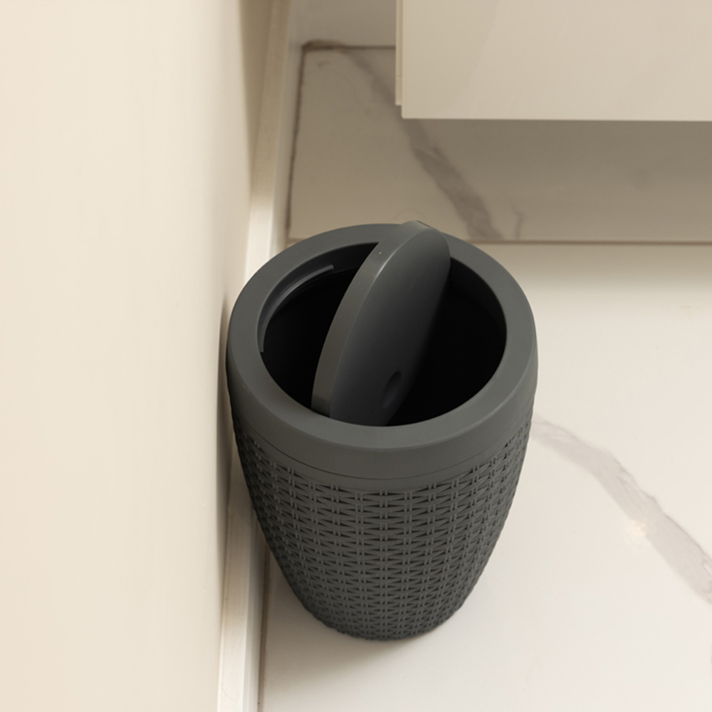 The ADDiS Charcoal Faux Rattan Bath Bin brings stylish storage to your bathroom. This spacious, lightweight bin boasts a discreet inner rim to hide liner bags, keeping your bathroom looking tidy and elegant. The convenient swing lid makes disposal effortless. Its faux rattan design adds a touch of modern style.