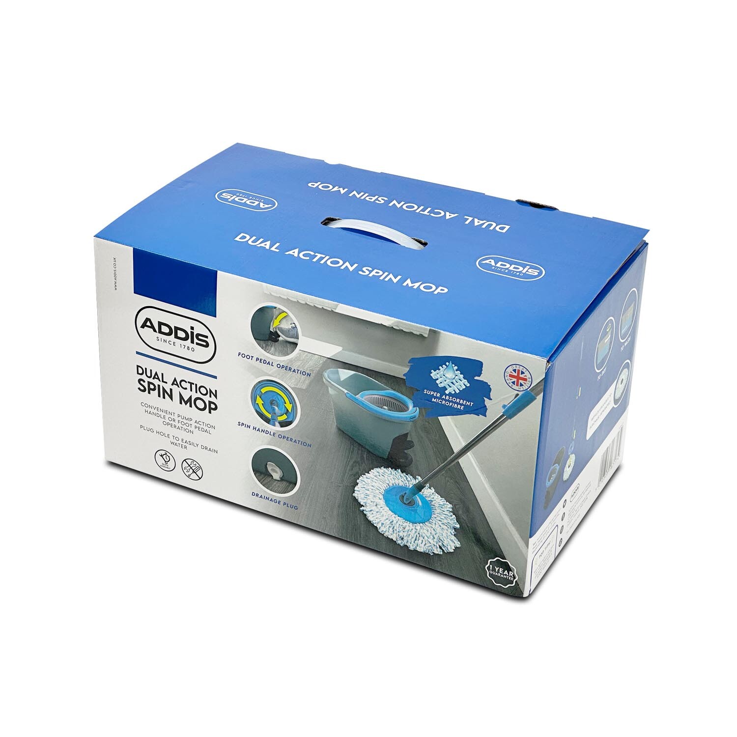 Effortlessly clean all your hard floors with the Addis Dual Action Spin Mop and Bucket. Its innovative pedal-powered wringer rapidly spins the mop head, removing excess water quickly. No more bending over – the pump action handle lets you wring out the microfiber mop head with ease using pressure or a simple twist. The bucket features a spin handle and a foot pedal to keep the mop head clean and a plug hole to easily drain dirty water. Designed to offer optimum performance, it is suitable for deep cleaning on all types of hard floors, including wood and laminate.