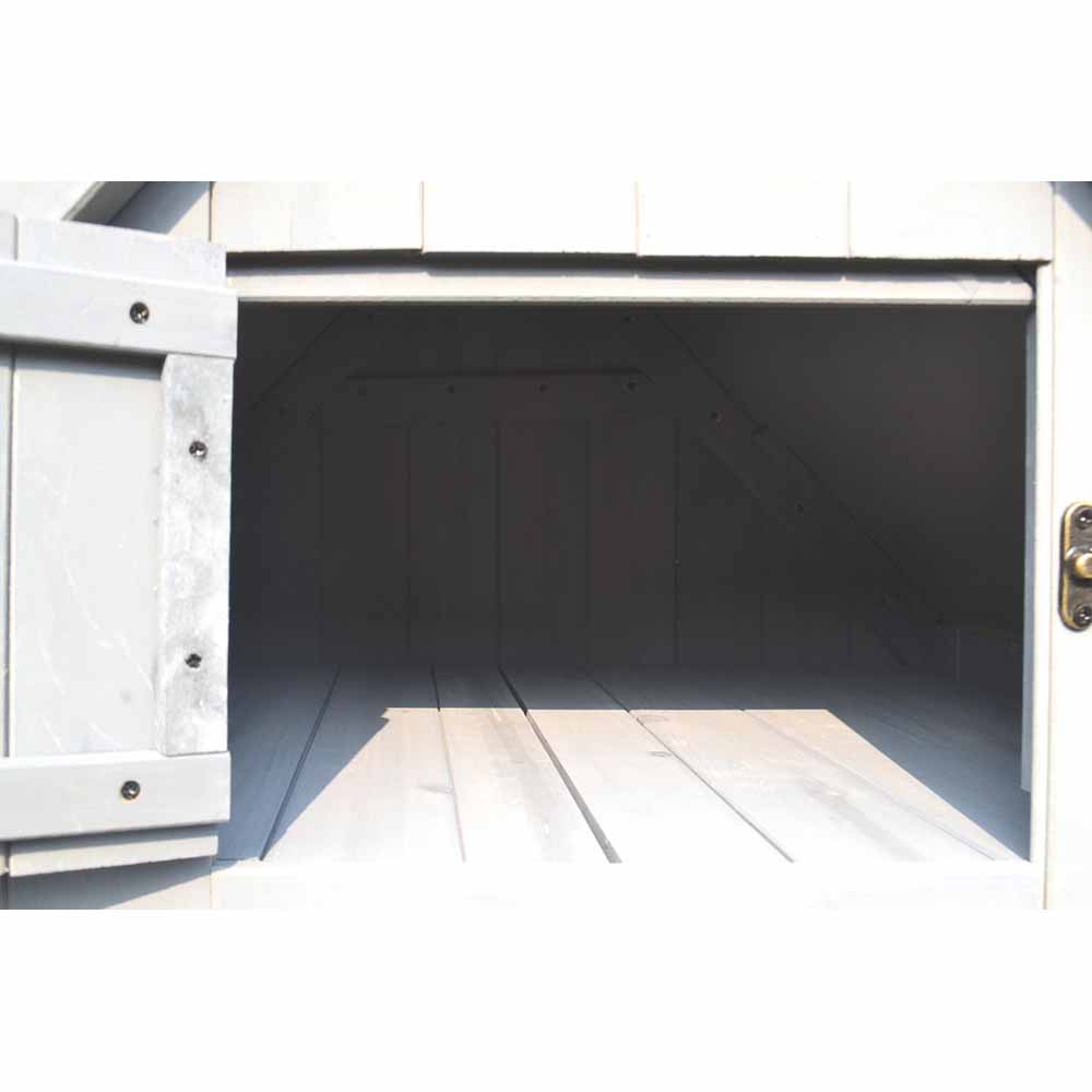 The Bideford wooden tool shed offers a stylish and practical solution for organising your gardening tools. With its elegant grey finish, this shed provides three adaptable storage spaces to accommodate both small and larger items. Inside, three half-sized shelves keep smaller tools secure and easily accessible, while an innovative upper shelf integrated into the roof offers ample space for essential horticultural supplies such as trowels, gloves, and weed killer. The remaining area is perfect for long-handled tools like spades, rakes, and forks, ensuring everything is neatly stored. Designed with security in mind, the shed features a metal latch that allows for the addition of a padlock, keeping your items safe. Made from durable Chinese fir wood sourced from managed forests, this shed is built to endure the elements, thanks to its weather-resistant construction. The heavy-grade mineral roofing felt and wooden drop latch further enhance its resilience, protecting your tools from rain, wind, and snow. Self-assembly is required, and the shed comes flat-packed for easy transport. The internal dimensions are 125cm in height, 63cm in width, and 43cm in depth, with a large door measuring 123cm high and 51cm wide, and a smaller door at 25cm high and 35cm wide. Transform your garden into a clutter-free space with the Bideford tool shed, where functionality meets style.