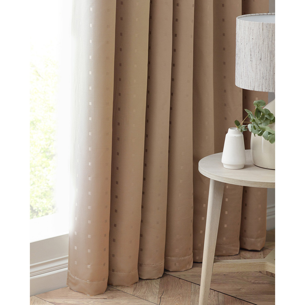 Transform your living space with the Madison Latte Ring Top Curtain. Its timeless appeal and heavy-weight poly-dobby fabric with contemporary eyelet heading create an elegant, modern look, perfect for adding sophistication to any room. The small woven square design adds a touch of unique style, while the 100% polyester construction ensures easy care and machine-washability. Enjoy year-round comfort, the fully lined, medium-weight drape provides insulation, keeping your space warm in winter and cool in summer. A luxurious retreat awaits—relax and entertain in style. Size: 168 x 183cm.