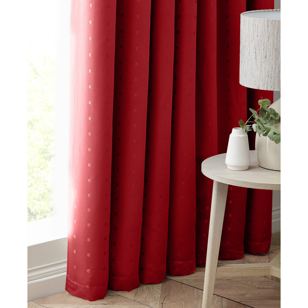 Transform your living space with the Madison Red Ring Top Curtain. Its timeless design and heavy-weight poly-dobby fabric create an elegant, modern look. The contemporary eyelet heading and subtle woven square pattern add sophistication, reflecting your unique style. Easy to maintain, this 100% polyester curtain is machine washable. Providing insulation, its fully lined medium-weight drape helps regulate temperature, keeping your room warm in winter and cool in summer. Enjoy a comfortable and stylish haven. Size: 168 x 137cm.