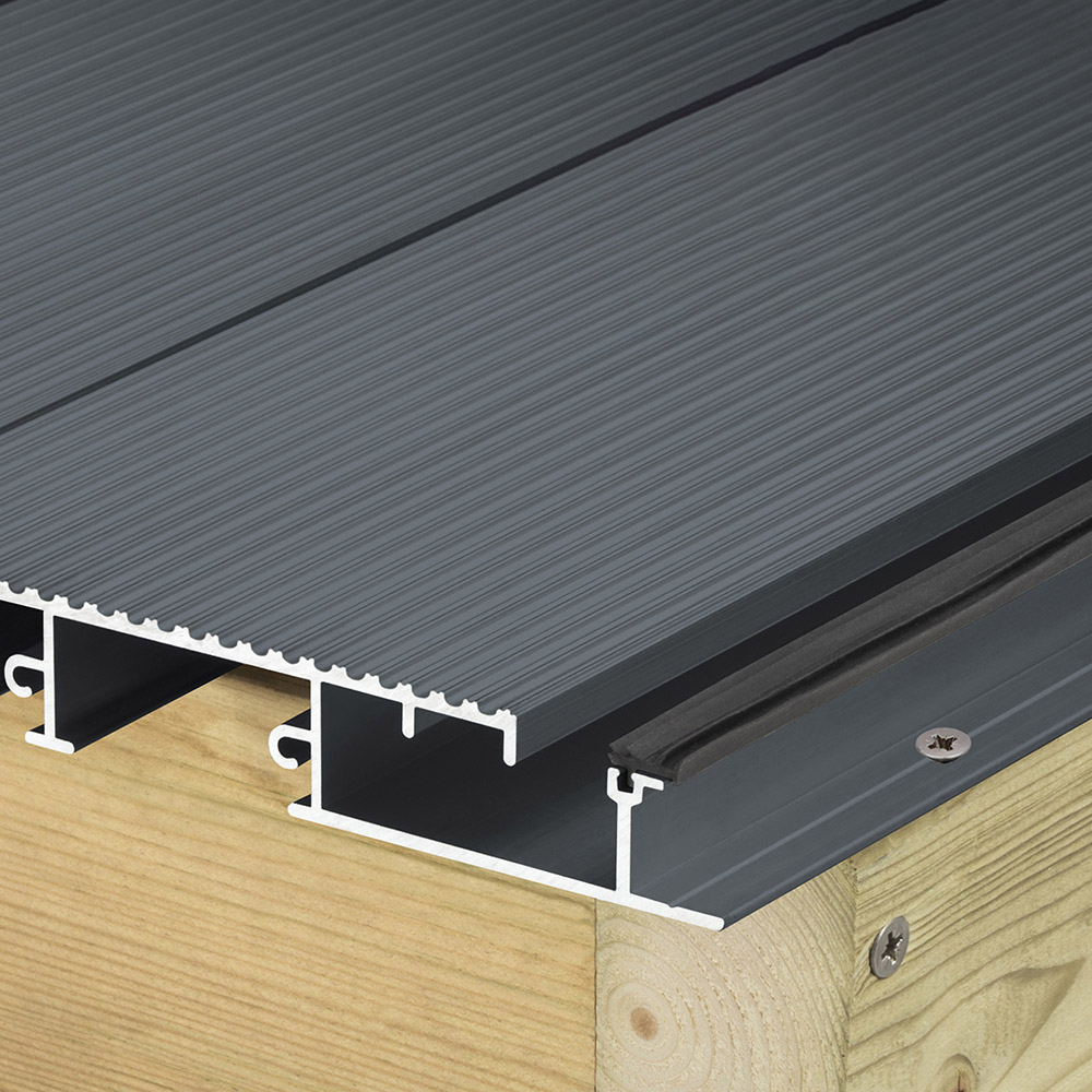 Enhance your outdoor space with the Alupave Grey Decking Board, a durable and stylish decking and flat-roofing system. Engineered for longevity, this system features a double-seal connexion between boards, preventing water ingress and protecting your substructure. The high-quality extruded aluminium construction, combined with a double-peak anti-wear surface, ensures it withstands heavy use. A key safety feature is its fire rating, making it suitable for high-rise applications. The integrated gutter system provides superior water management, while completely concealed fasteners deliver a clean, contemporary aesthetic. Available in 3m lengths.