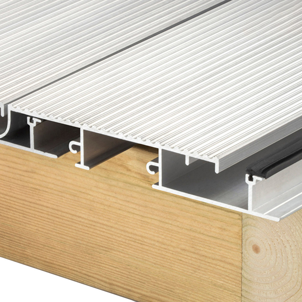 The Alupave Mill Decking Board: a durable and stylish decking and flat-roofing solution. Engineered for superior performance, its innovative double-seal connexion system ensures rapid installation and eliminates water infiltration. Built to last, the extruded aluminium structure and double-peak anti-wear surface withstand heavy traffic and extended use. Ideal for high-rise applications due to its inherent fire resistance, it also features an integrated gutter system and concealed fasteners for optimal water management and a clean, sophisticated look. Available in 3m lengths.