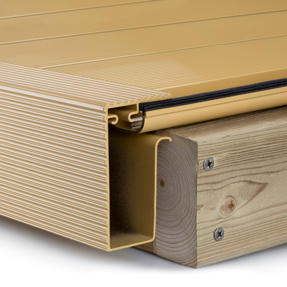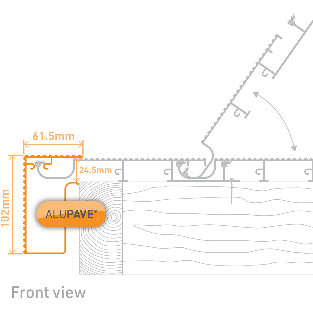 The Alupave Sand Decking Side Gutter neatly finishes the edge of your decking and flat roofing. Its unique double-peak design resists wear, ensuring a long lifespan even with heavy use. The completely concealed fastening creates a sleek, modern look, while the aluminium construction provides fire resistance suitable for high-rise buildings. Quick installation is achieved thanks to the Alupave system',s interlocking mechanism. Available in 6M lengths.