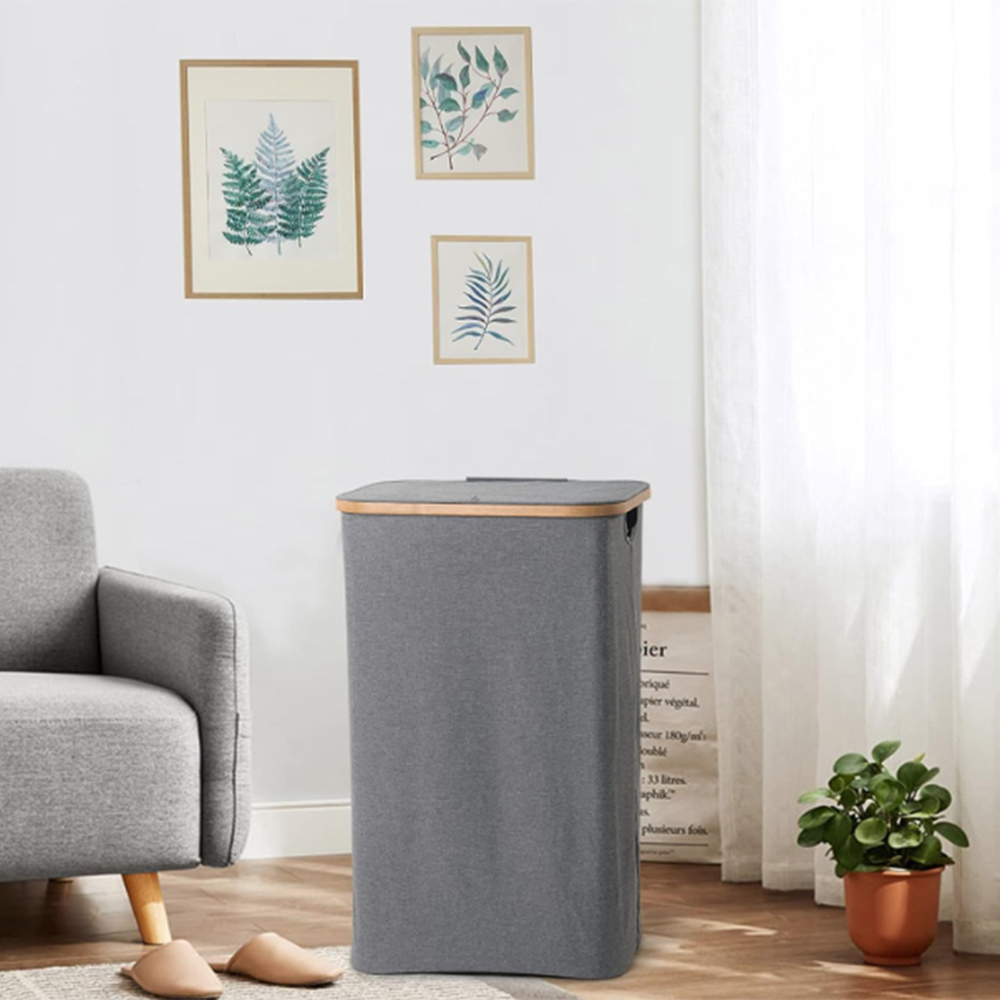 The AMOS Eezy Grey Square Laundry Basket with Lid is an eco-friendly and stylish way to manage your laundry. Made from durable bamboo and cotton cloth, this 100-litre basket offers ample space for clothes. The lid keeps laundry hidden and prevents odours from escaping, while an inner laundry bag helps organise different clothing types. Its square shape is perfect for corners, saving space and adding a touch of elegance to your home.