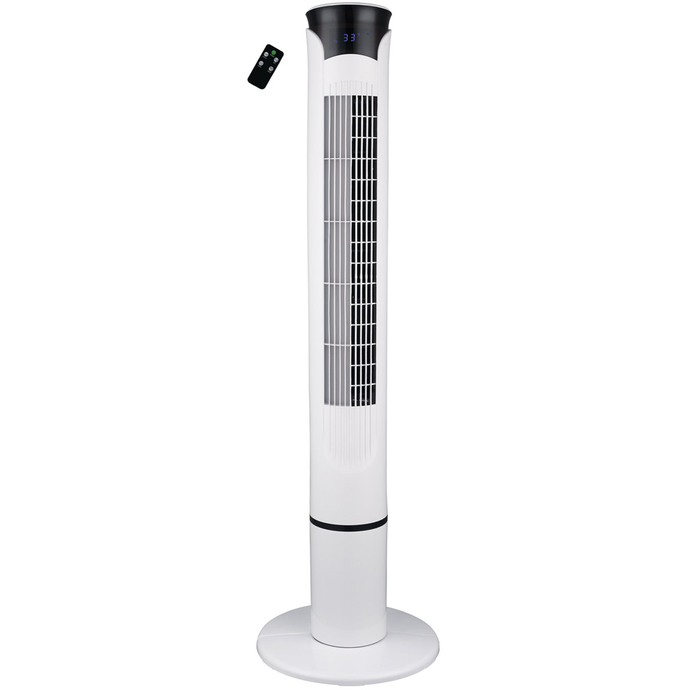 Enjoy cool comfort with the AMOS White Tower Fan, a stylish addition to any home or office. Its slim profile makes it perfect for smaller spaces, while delivering effective air circulation throughout the room. Select from three speeds and utilise the oscillation function for optimal air distribution, ensuring a refreshing breeze even on the warmest days. Choose your ideal climate with normal, natural, and sleep modes; the natural mode mimics a gentle, natural breeze, and the sleep mode gradually reduces airflow for undisturbed rest. Powerful yet whisper-quiet, it’s ideal for bedrooms. A convenient 7.5-hour timer and remote control allow for effortless adjustments, complemented by an LED display showing the temperature and a user-friendly soft-touch control panel. Standing at 101.6cm tall and just 21cm wide, this elegant tower fan is a sophisticated solution to staying cool, seamlessly blending style and functionality.