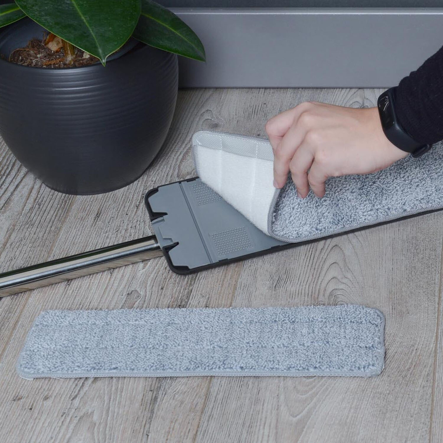 Flat Squeeze Mop and Bucket Set, black. Features a dual-chamber bucket for efficient water separation and a flat mop head with a removable, washable cloth. Compact and lightweight for easy storage. Refills available separately.