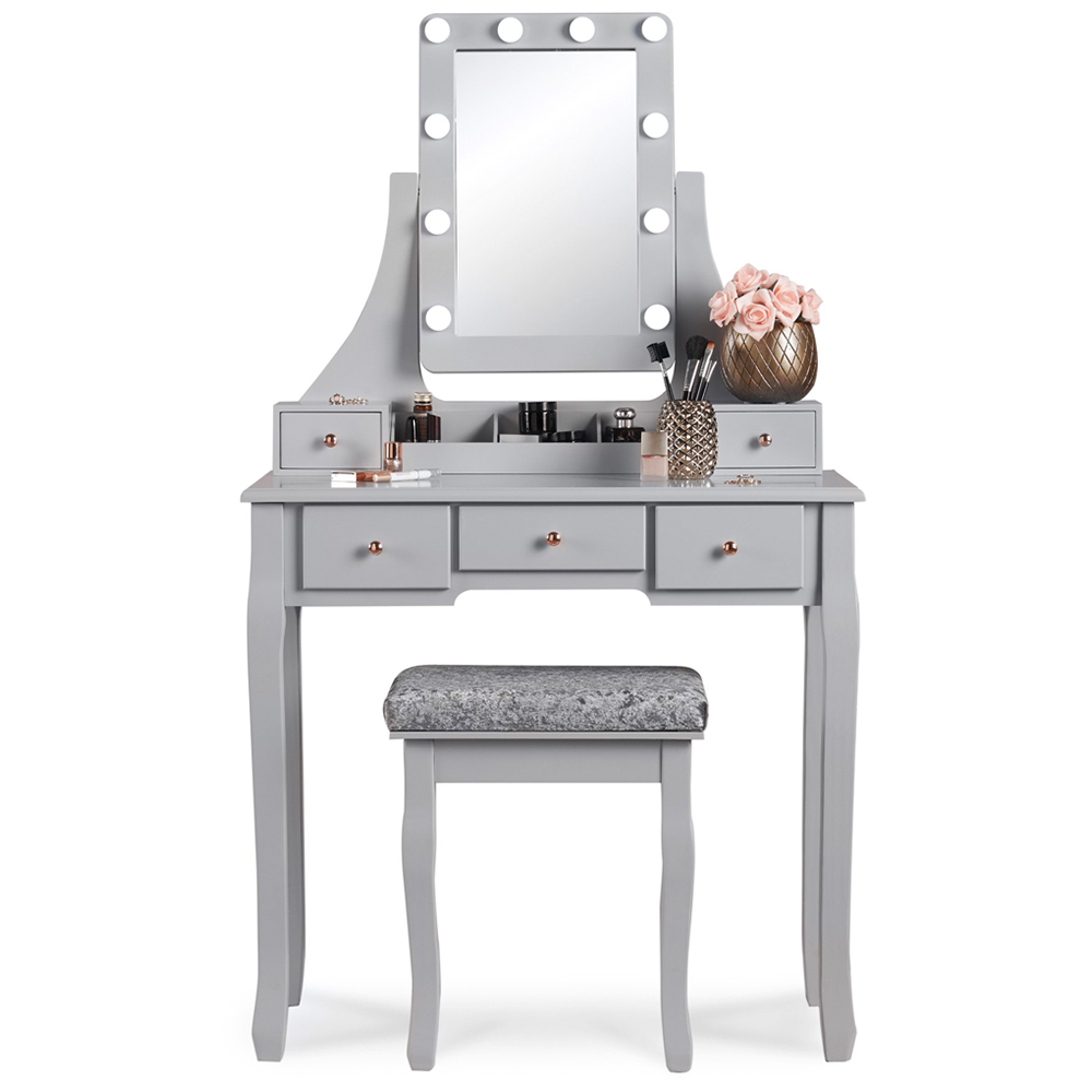 Transform your space with this elegant grey vanity dresser, complete with a striking rectangular mirror powered by Hollywood LED bulbs. Featuring five storage drawers, it provides ample room for all your beauty essentials and accessories. The set is complemented by a matching padded stool, ensuring both comfort and style as you get ready for the day. This vanity dresser is not just a functional piece but also a chic addition to your home, perfect for creating a glamorous beauty corner.