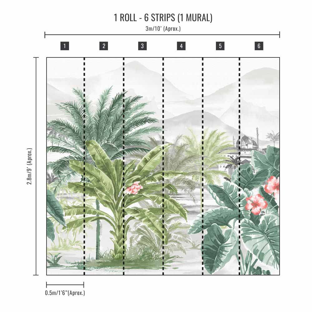 Bring the tranquillity of a tropical paradise into your home with this breathtaking wall mural. Vibrant green palm trees and pink flowers pop against a backdrop of muted grey rolling hills, creating a stunning feature wall. Easy to install with six strips for simple application, this atmospheric mural uses a paste-the-wall method with a straight match design.