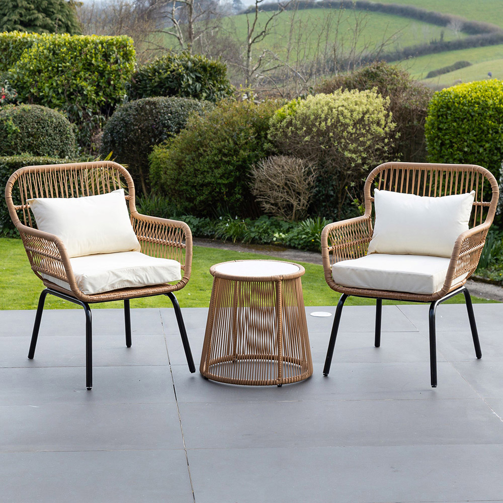 Infuse your outdoor space with the timeless elegance of the Carbini 3 Piece Patio Set. This vintage-inspired rattan set, comprising two elegant chairs and a perfectly sized side table, is designed to enhance your alfresco moments. The light brown rattan construction exudes a classic appeal, beautifully complemented by plush cream cushions that promise exceptional comfort. Ideal for relaxed outdoor gatherings or tranquil mornings, the Carbini set seamlessly marries classic aesthetics with modern practicality. Enjoy swift, efficient delivery throughout the UK and elevate your outdoor living experience in no time.
