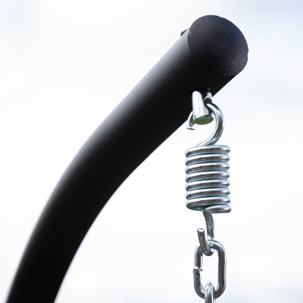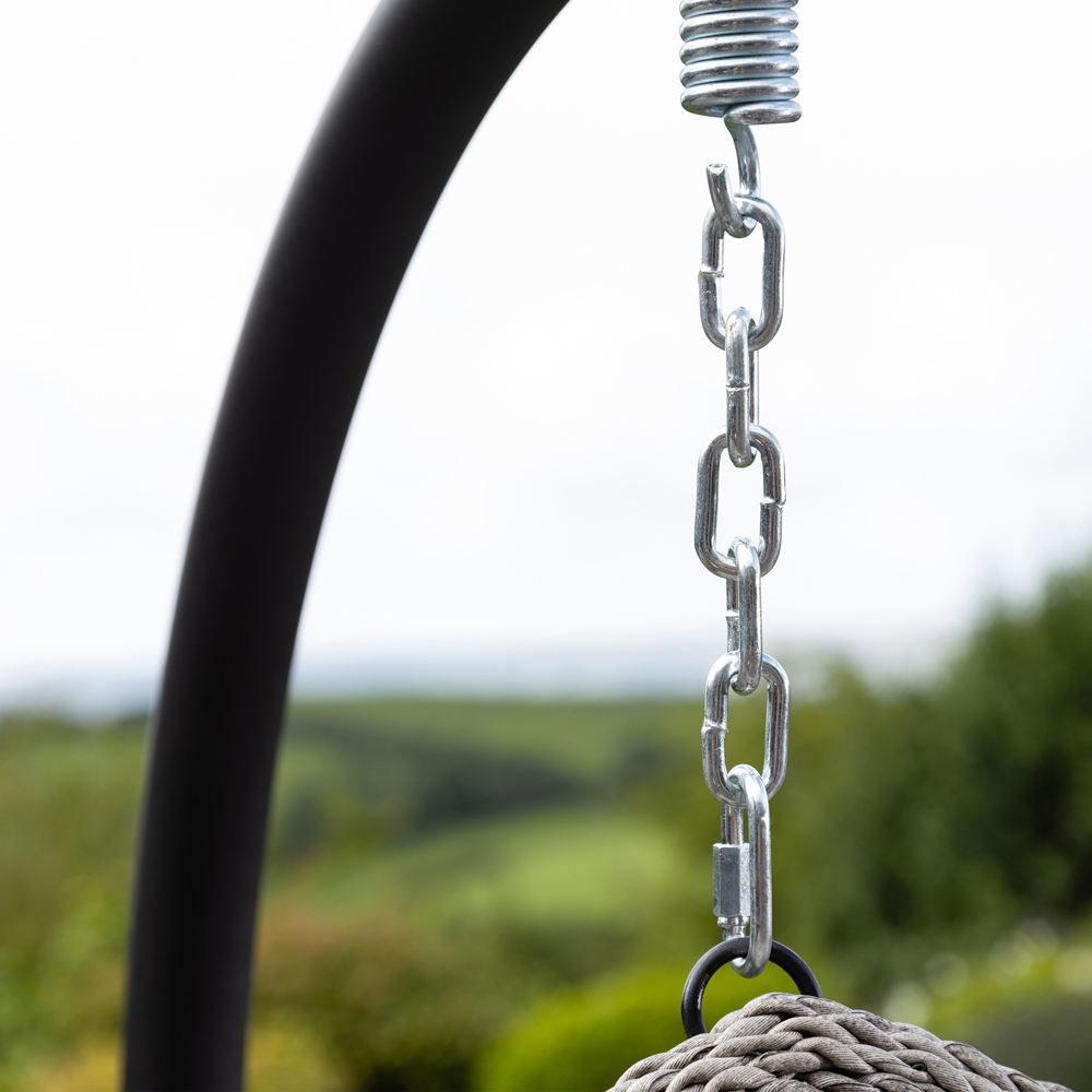 Relax and unwind in the Bradshaw Dark Grey Swing Egg Pod Chair, a stylish addition to any garden. This outdoor swing is ideal for sunny days spent reading or simply enjoying the peace and quiet. The durable powder-coated metal frame provides lasting stability, and the attractive rattan-effect hanging basket complements various outdoor decors. Soft, water-resistant, fibre-filled cushions offer comfort in any weather, while a robust spring suspension system provides a gentle rocking motion. With a weight capacity of 150kg, this swing chair is both strong and reliable. Best of all, our two-person team will deliver and assemble your chair for a truly hassle-free experience.