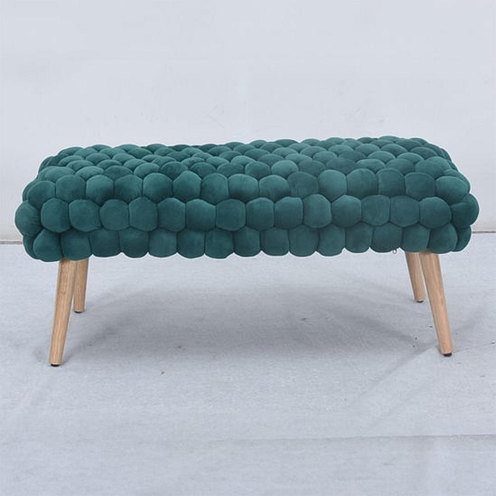 Indulge in comfort and style with the Cushla footstool. Wrapped in luxuriously soft, dark green bubbly velvet, this charming piece effortlessly blends modern luxury with minimalist appeal. Its light Scandi-style wooden legs provide a timeless touch, complementing both contemporary and classic interiors. Hand-finished with delightful bobbles, the Cushla adds a unique character to any room. Perfect as a footrest, extra seat, or stylish accent, this compact footstool is equally at home in the living room, bedroom, or home office.