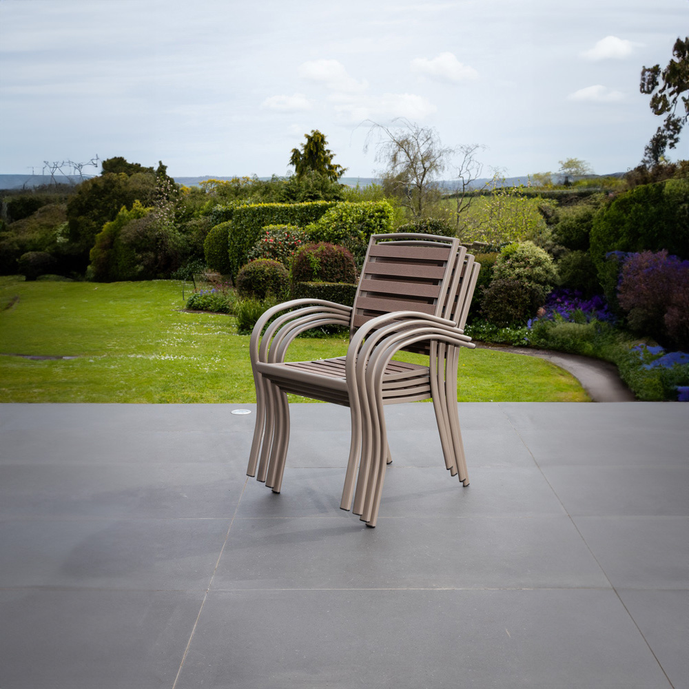 Enjoy effortless outdoor entertaining with the Delamere 4 Seater Outdoor Dining Set. This stylish set features a powder-coated metal frame and a durable, rustic-looking solid PS wood effect plastic tabletop and chairs. The generously sized table (130 x 70cm, 75cm high) offers ample space for meals and drinks with family and friends, while four stackable chairs, each with a cream, weather-resistant cushion, provide comfortable seating. Create the perfect outdoor oasis with this elegant and practical set.