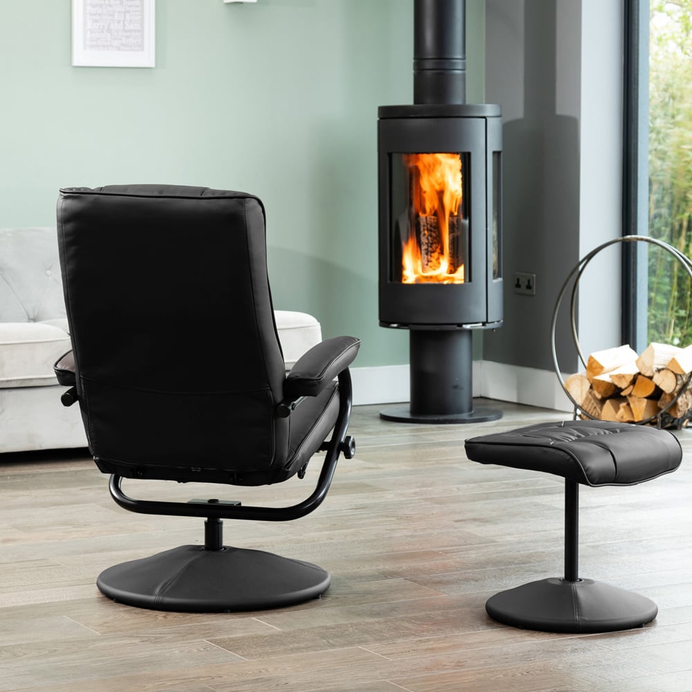 Indulge in ultimate relaxation with the Artemis Home Gibson Swivel Recliner and Footstool. This sophisticated set, finished in black bonded leather, will add a touch of timeless elegance to any room. Enjoy complete freedom of movement with the full 360-degree swivel function, while the smooth push-back recline allows you to effortlessly find your perfect lounging angle, ensuring maximum comfort. Built to last, the robust metal frame provides unwavering support and stability, complemented by a plush foam seat interior for lavish cushioning. Faux leather is cleverly incorporated in low-stress areas, ensuring a luxurious look and feel without sacrificing affordability or quality. Transform your space into a haven of relaxation with this stylish and comfortable recliner set, delivered quickly and efficiently.