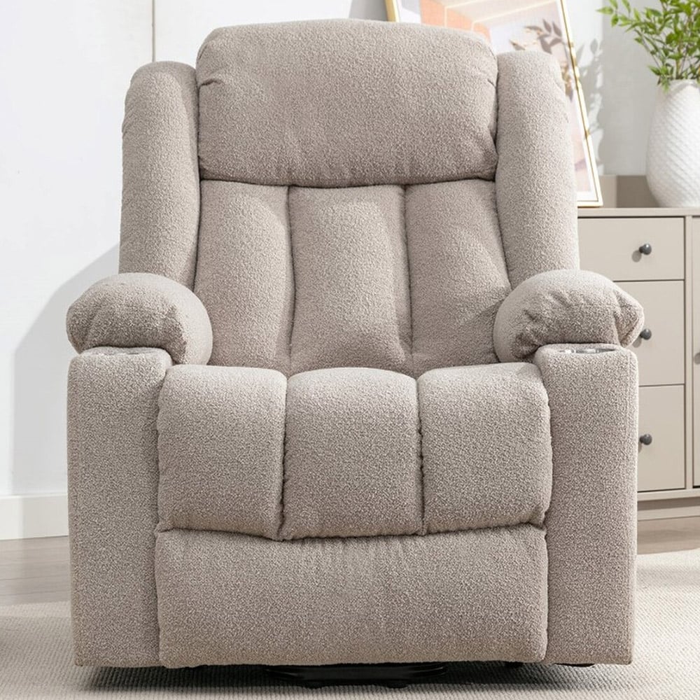 Simple and elegant, the Artemis Home Lovell recliner armchair exudes comfort and relaxation. The luxurious light brown boucle fabric upholstery makes Lovell a truly stylish addition to your living room. Complete with a coil-sprung and foam-filled interior, and generously padded backrest, this electric recliner chair is the perfect seat to unwind in after a tiring day. Enjoy a hassle-free setup with our inclusive two-person delivery and assembly service. The integrated cup holder in the armrests adds practicality, while strategically positioned massage points in the seat, lower back and upper back offer pure relaxation. For the ultimate indulgence, the warming heat function in the lumbar area takes your relaxation to new heights.