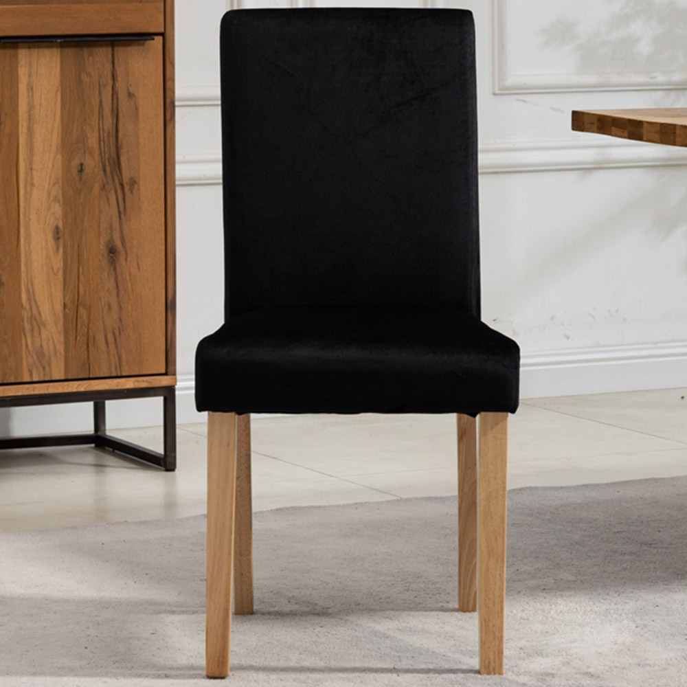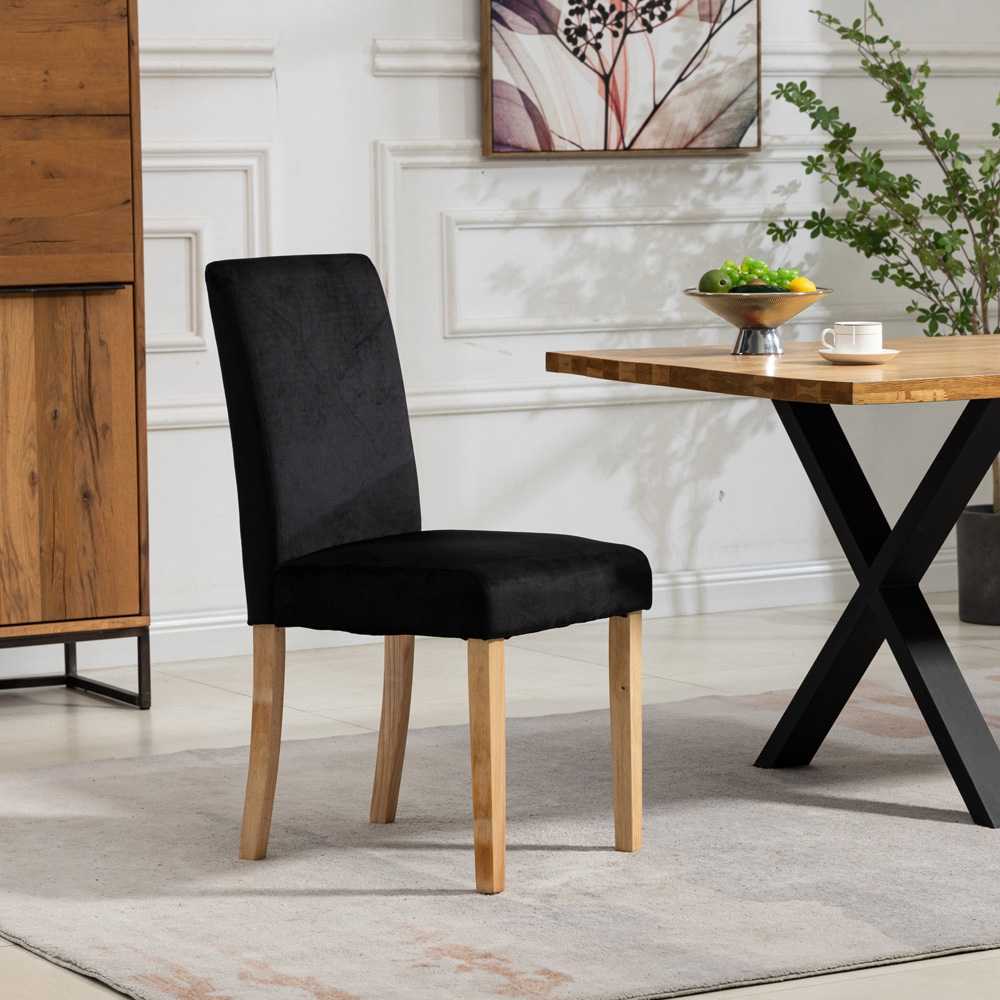 Elevate your dining area with the Maiolo dining chairs. This set of two boasts luxurious black velvet upholstery, draped over a robust solid wood frame for lasting comfort and style. The high-backed design offers excellent support, while the pine-coloured wooden legs provide a touch of natural elegance and ensure stability. Effortless self-assembly makes adding a touch of sophistication to your home a breeze. Perfect for creating a striking contrast or complementing your existing décor, these chairs are ideal for entertaining or enjoying everyday meals.
