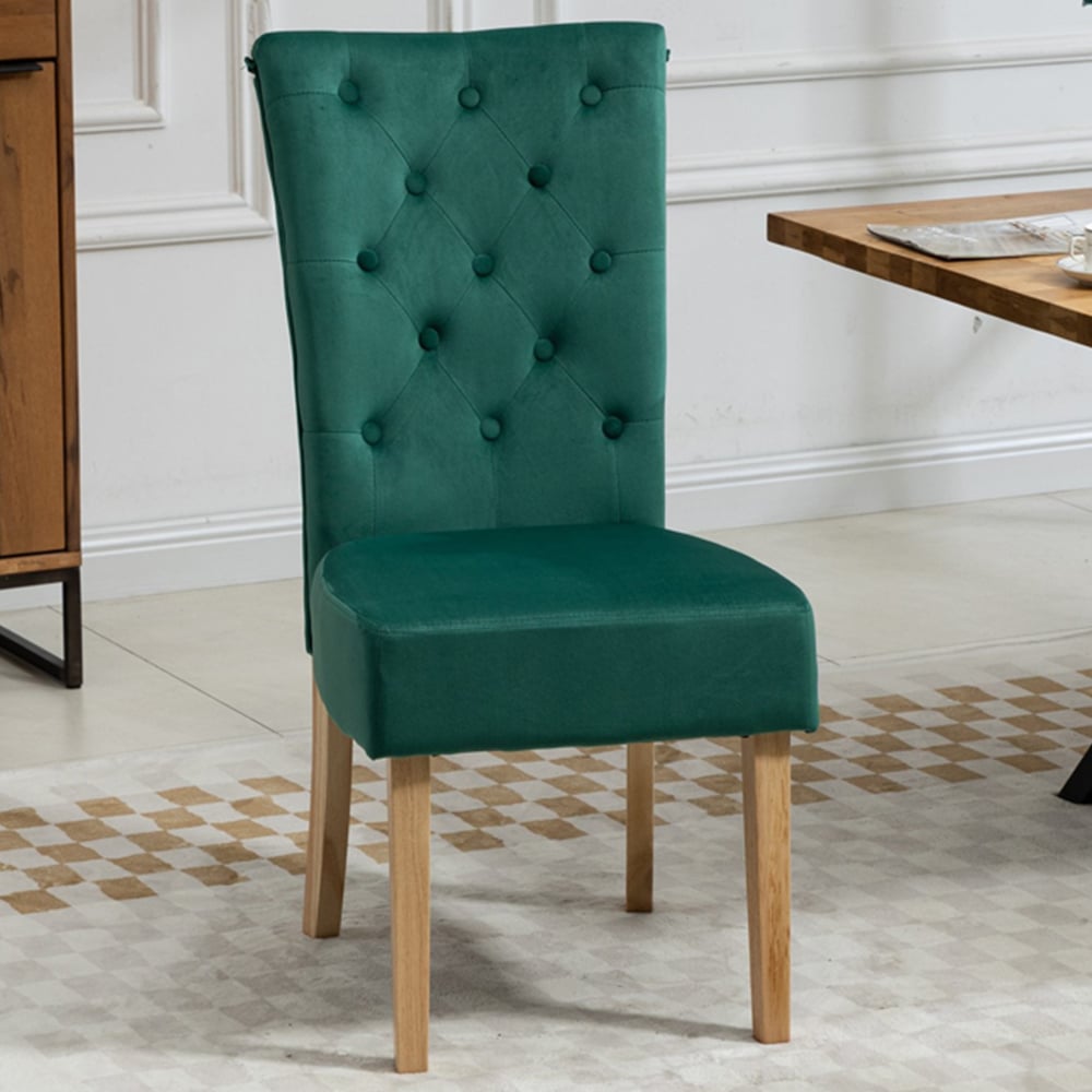 Elevate your dining area with the Pienza velvet dining chairs. This set of two chairs boasts a luxurious blend of comfort and style. Crafted with a solid wooden frame and plush velvet upholstery, they offer enduring quality and a touch of opulence. The high studded back provides excellent support, while the pine-coloured wooden legs add a warm, natural element to your décor. Effortlessly assemble these chairs and create a striking focal point, complementing your existing style or adding a vibrant contrast. The perfect addition for relaxed dining with family and friends. The chairs are green.
