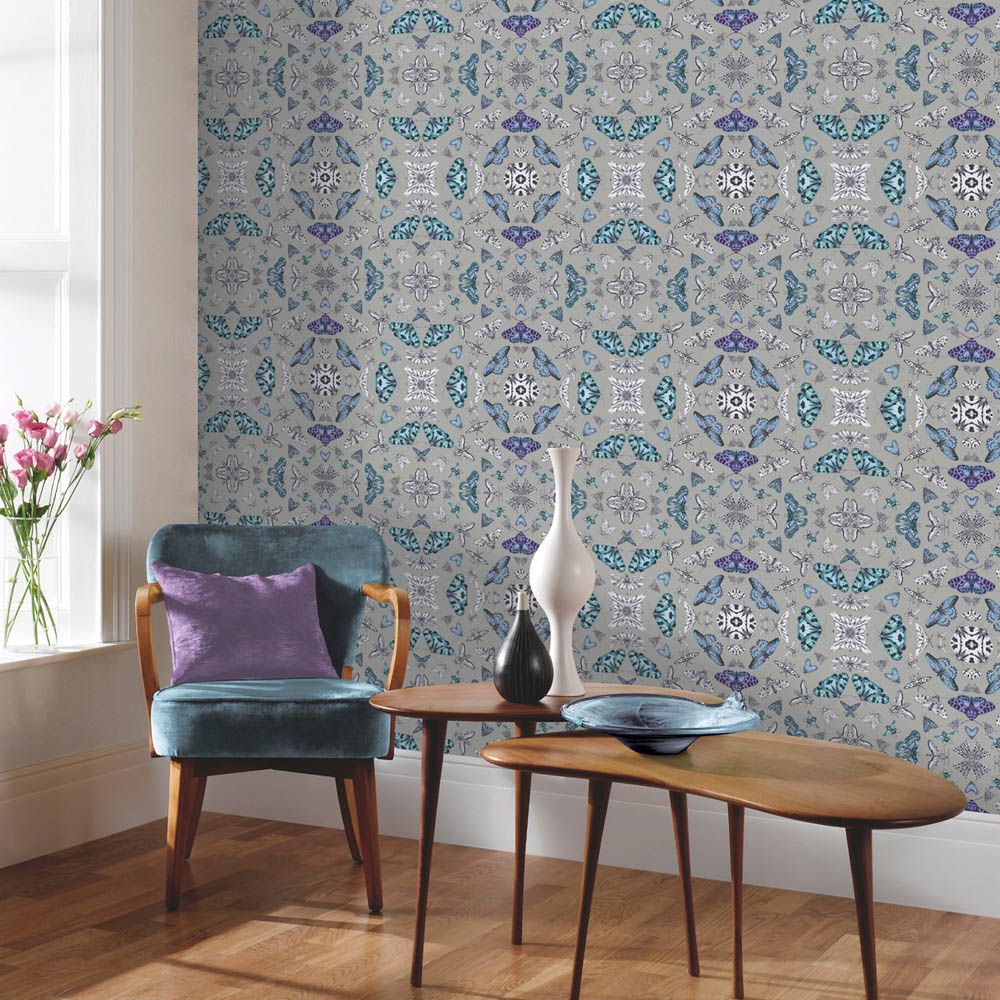 Transform your space with the whimsical Glitter Bug Wallpaper. This playful design features hand-drawn multi-coloured bugs and butterflies, creating a captivating kaleidoscope effect. The silver background complements the vibrant winged creatures, bringing any wall to life. This paste-the-wall wallpaper boasts a roll size of 53cm x 10.05m and a straight match pattern.