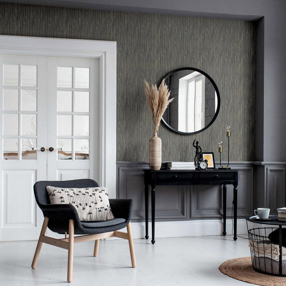 Transform your space with the Japandi Grasscloth Charcoal Grey and Gold Wallpaper. This stunning wallpaper boasts a textured grasscloth effect in a dramatic charcoal grey, accented with gold for an elegant finish. Perfect for a living room or bedroom, this semi-plain design works beautifully on all four walls. Handcrafted for a clean, luxurious look, it's paste-the-paper for easy hanging. With a straight match and 53cm pattern repeat, each roll measures 1005cm in length and 53cm in width.