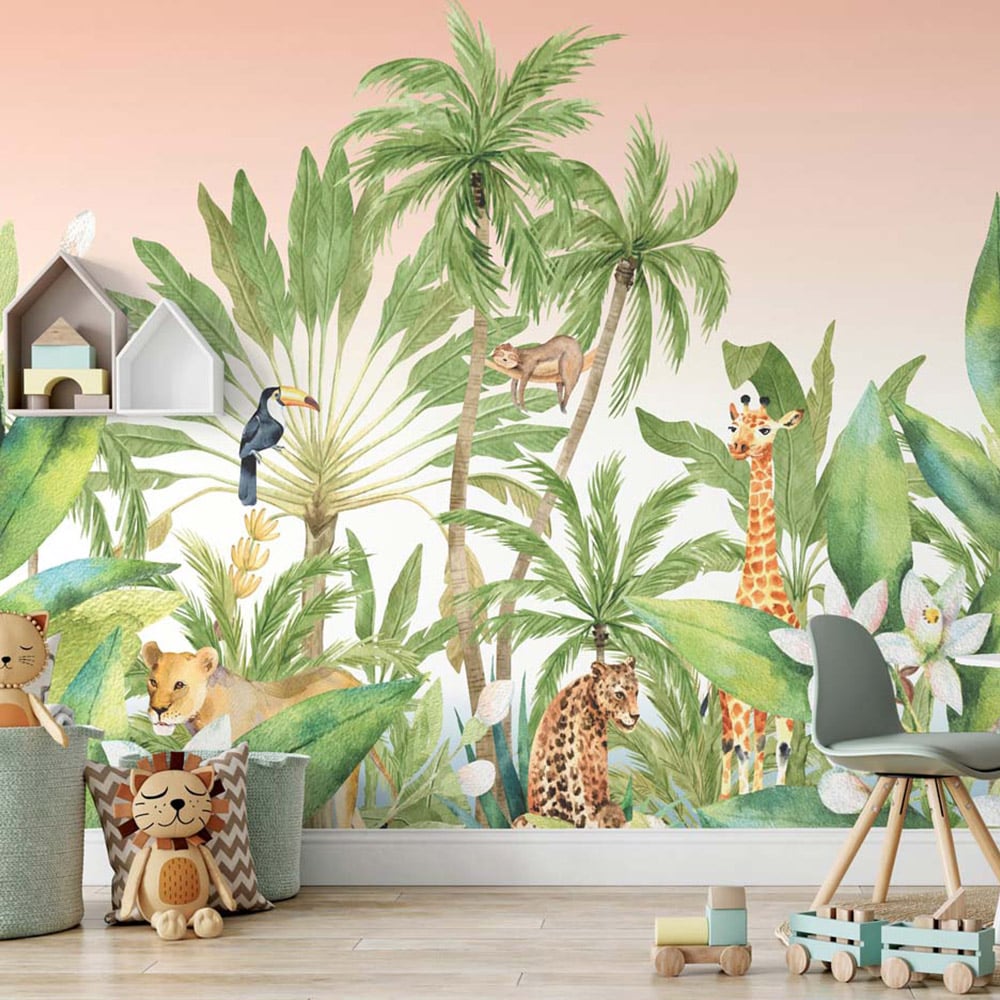 Bring the rainforest home with the Arthouse jungle time design mural. This captivating scene features lions, monkeys, sloths, and a cleverly hidden giraffe amongst the lush foliage. High-resolution digital printing ensures a crisp finish with no pixelation or loss of quality. Paste-the-wall application makes hanging easy, this expansive mural arrives on one continuous roll, measuring an impressive 3m wide x 2.75m high – one of the largest murals available.