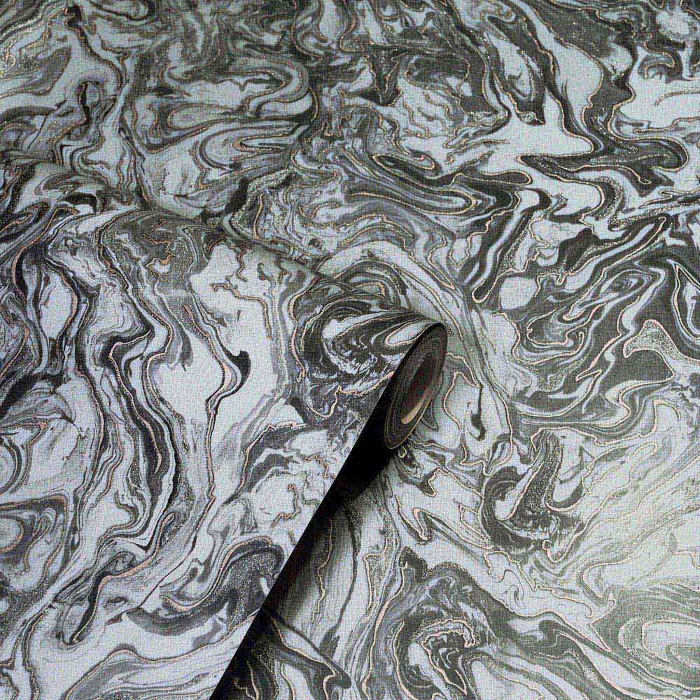 This luxurious liquid marble wallpaper will instantly upgrade your home's style. Swirling charcoal and grey tones, accented with metallic glitter, create a stunning marble effect. Perfect for a feature wall in any living space, from bedrooms to open-plan living rooms, this easy-to-apply, spongeable wallpaper offers effortless elegance. With a 26.5cm offset pattern match and 53cm repeat, each 10.05m long roll is 53cm wide. Paste the paper for simple hanging.