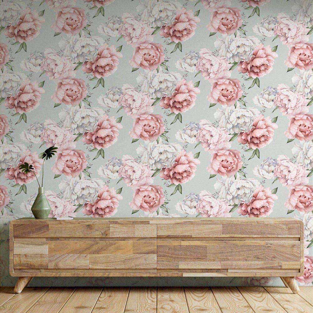 Transform your space with this elegant floral wallpaper, showcasing a stunning arrangement of large-scale peonies in delicate white and pink hues. Subtle glitter accents add a touch of sparkle against the soft mint background. Perfect for a feature wall or complete room transformation, this paste-the-paper wallpaper boasts an offset pattern match of 26.5cm and a 53cm repeat. Each roll measures 10.05m in length and 53cm in width.