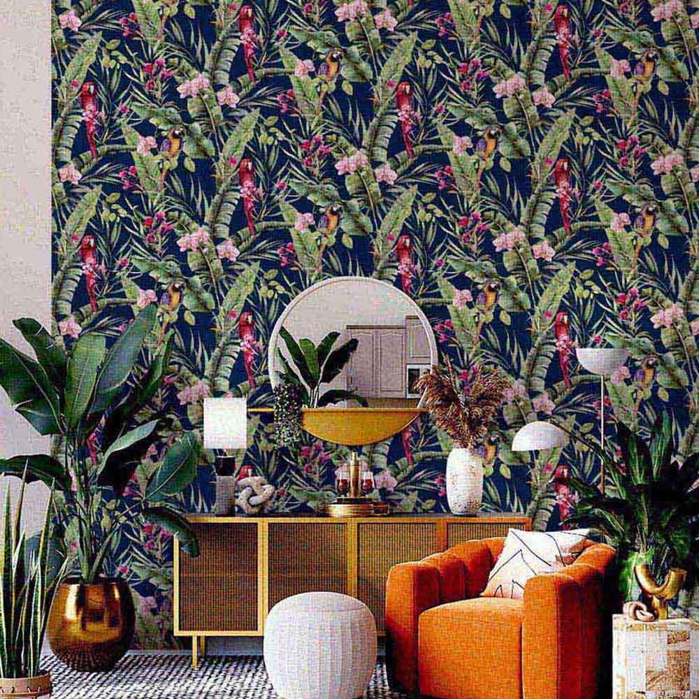 Escape to a vibrant jungle with Arthouse's Pretty Polly wallpaper. Bold botanicals, florals, and animals, including colourful parrots, pop against a rich navy background. This striking design is perfect for adding a dramatic, contemporary touch to a living room or bedroom feature wall. Paste the paper application. Offset pattern match: 26.5cm. Pattern repeat: 53cm.