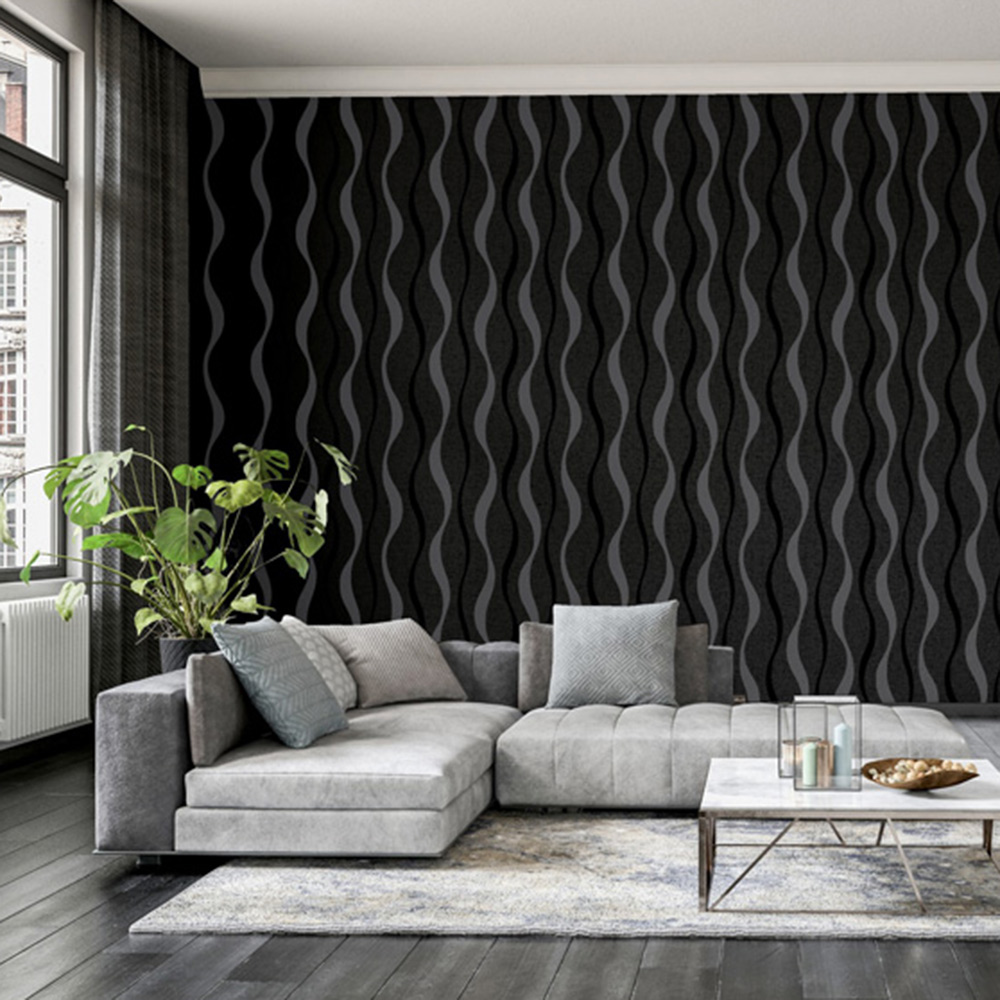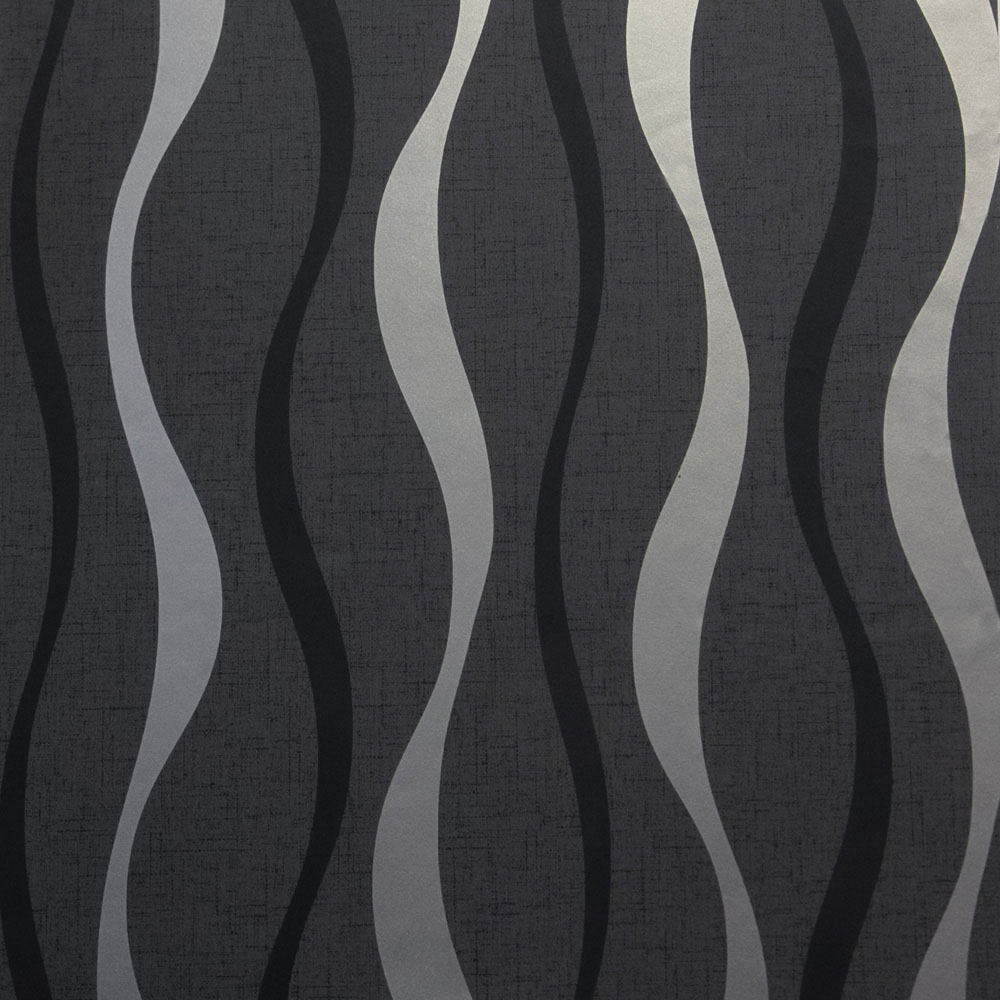Transform your space with the Ribbon Geometric Black Wallpaper, a dramatic design featuring a black matt background and elegant wavy grey patterns. This wallpaper offers a chic, contemporary style perfect for creating a striking feature wall in a living room or bedroom. Its handcrafted design provides an upscale, clean look. Paste-the-paper application simplifies installation. Pattern match is straight, with a 63cm repeat. Each roll measures 1005cm in length and 53cm in width.