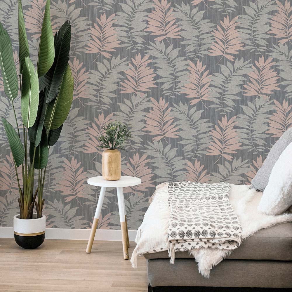 Add understated glamour to your walls with Stardust Palm, a stunning botanical wallpaper. Featuring chic rose gold and charcoal grey leaf silhouettes against a textured dark grey backdrop, this versatile design works beautifully as a feature wall or across an entire room. Its durable vinyl construction makes it perfect for high-traffic areas, while its design cleverly conceals minor wall imperfections for a flawless finish. A paste-the-paper application ensures easy hanging. Straight match pattern repeat: 53cm. Roll length: 10.05m, Roll width: 53cm.