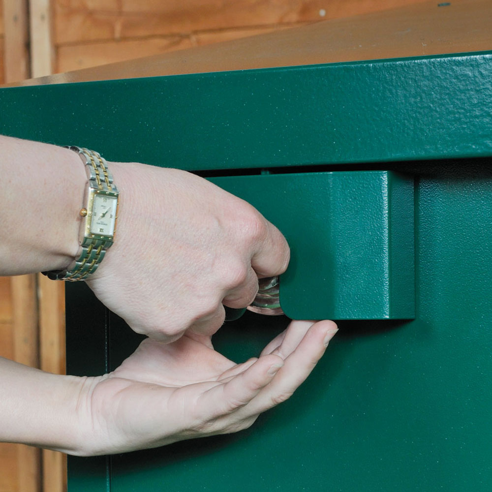 Take the hassle out of bike storage with the Asgard Access Double Door Cream Bike Storage Shed 7 x 4ft. This heavy-duty, all-metal bike shed gives you secure storage for up to four bikes plus all your cycling equipment in one place. Security is serious here as this shed features level eight-rated, keyed-alike padlocks with stainless steel shrouds and reinforced locking points, all designed to resist tampering and keep your gear safe from thieves. This shed is built from thick, galvanised, weatherproof steel and reinforced with stainless-steel components. Inside, you will find a full metal floor and plenty of room for everything from helmets to tools and spare parts. Getting in and out is easy too, thanks to large double doors and a gas-assisted lift-up lid, so you can access your bikes without juggling handlebars or fighting for space. The built-in ventilation system helps prevent condensation and keeps airflow moving, so your bikes stay in great condition, even in tough weather. Please note that this listing is for the unit only. Accessories shown in the picture are not included; they are just for illustration. You must place this shed on a solid surface like concrete or tarmac. It’s not suitable for grass, soil, hardore, or eco bases. The base size recommended is 2200 x 1150mm. Internal measurements: 1320mm (back height) / 1120mm (front height) x 910mm (depth) x 1980mm (width).