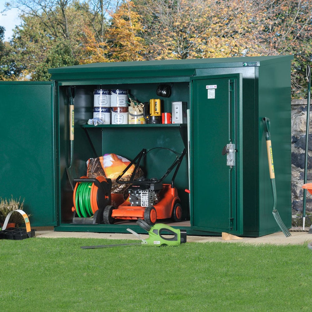 Get all your garden equipment sorted in one safe spot with the Asgard Addition Double Door Grey Garden Shed 6 x 3ft. It is a tough, all-metal shade which is built to keep all your gardening tools and equipment safe and sound. Made from thick, galvanised steel panels, this shed is weatherproof. It comes with an integral metal floor, stainless steel hinges, and a double door system that you can choose to open on the left or right side. The pick and drill resistant locks give you professional-level security, so you know your tools are protected. There’s even a rain guard above the door, no more water dripping on your feet when you are grabbing your tools in the rain. Inside, it’s fully ventilated with an integral ventilation system to help air flow properly and keep condensation to a minimum. This means your tools and equipment stay in better condition, even when sorted long-term. Accessories shown in the picture are not included; they are just for illustration. You must place this shed on a solid surface like concrete or tarmac. It’s not suitable for grass, soil, hardore, or eco bases. The base size recommended is 1990 x 1100mm. Internal measurements: 1438mm (back height) / 1335mm (front height) x 807mm (depth) x 1725mm (width).