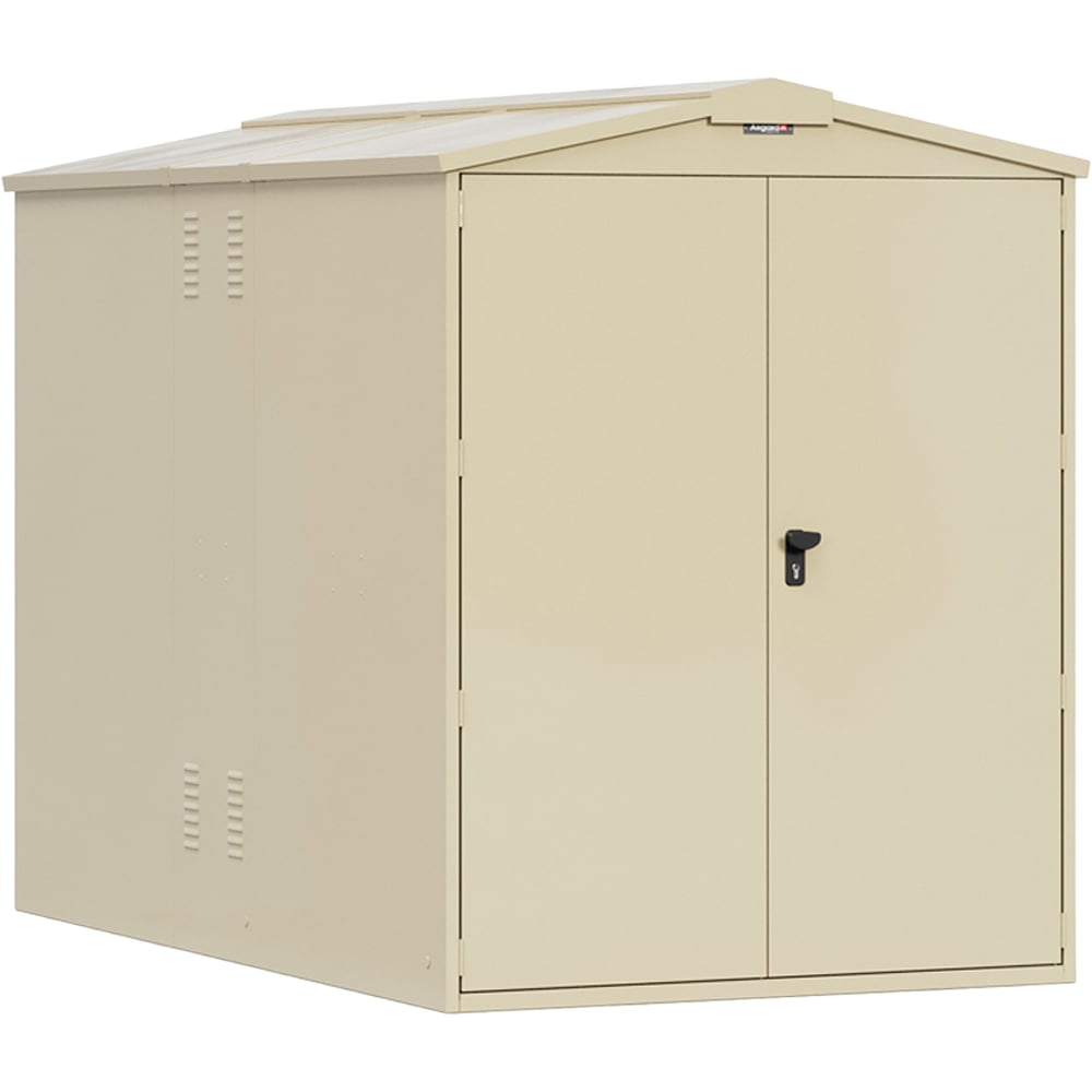Protect your two-wheelers from elements using the Asgard Centurion Double Door Cream High Security Apex Motorcycle Garage 5 x 9ft. This ultra-secure motorcycle shed garage is locksmith-approved, insurance-approved, and police preferred. Made from heavy-duty, weatherproof steel, this compact shed is built to handle the job and keep your motorcycle, all your maintenance tools, and general equipment safe. It’s packed with security features, including pick and drill-resistant locks, a five-point locking system with solid steel deadbolts, snap-off theft-resistant handle, reinforced doors, stainless steel hinges, and heavy-duty steel panels. Whether it’s garden tools or your weekend ride, your kit is staying put. Inside, you will find an integral metal floor and loads of room for tools, bikes, and gardening equipment. The large double doors make getting things in and out easy, no more tight squeezes or awkward lifting. Ventilation is built into the design to help stop condensation and keep the air flowing, so everything inside stays dry and in good shape all year round. It comes complete with a ramp, protective wooden subfloor, shelf, hook rail and electric socket mounting plates. You must place this shed on a solid surface like concrete or tarmac. It’s not suitable for grass, soil, hardore, or eco bases. The base size recommended is 1730 x 3215mm. Internal measurements: 1950mm (apex) / 1760mm (eaves) x 2620mm (depth) x 1460mm (width).