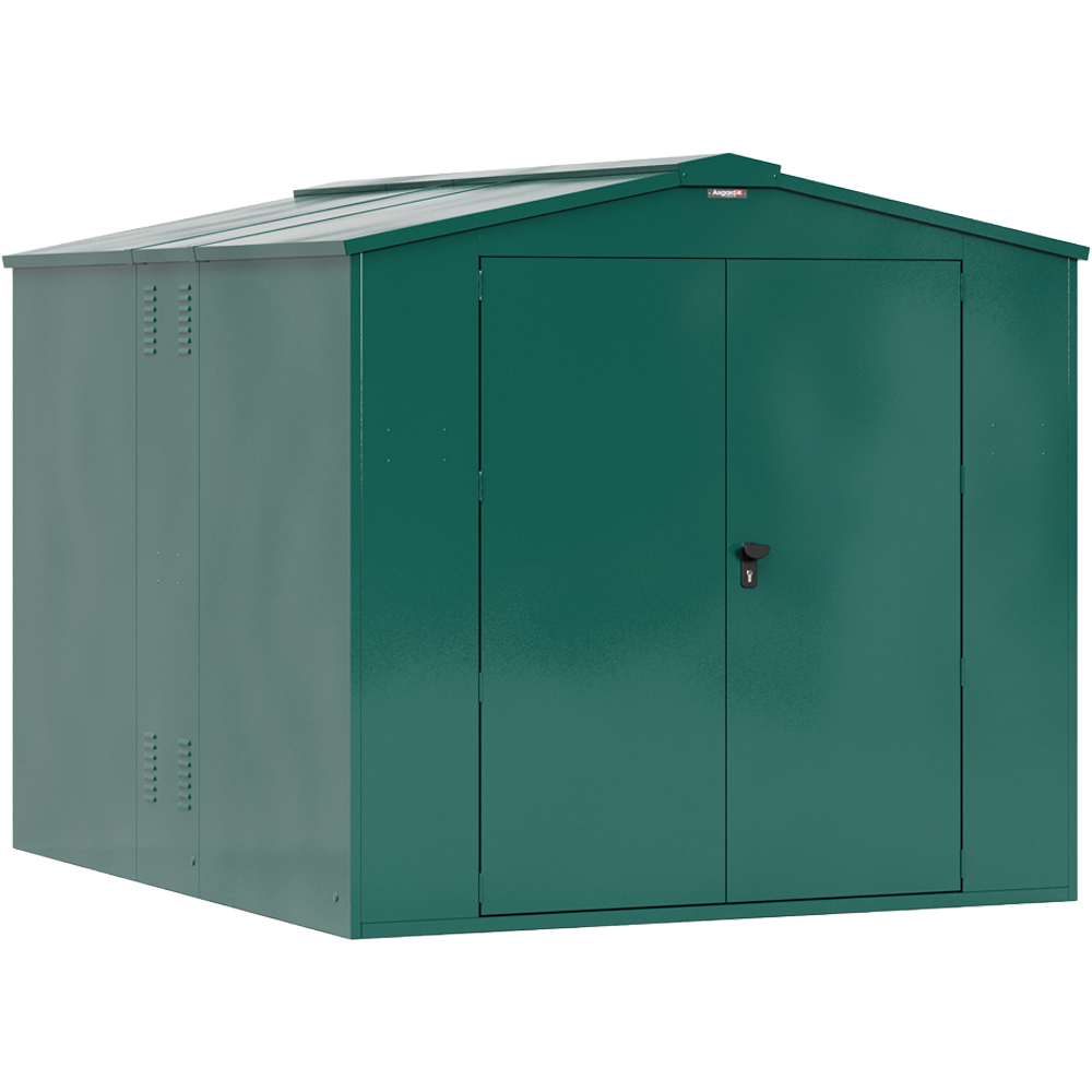 Store and keep your bikes safe with this Asgard Gladiator Double Door High Security Apex Bike Storage Shed. Offering space for eight bikes, it is a 100% British-made, Secured by Design (Police Preferred Specification), Locksmith-Approved and Insurance-Approved multi-purpose shed, providing exceptionally secure storage for all of your bikes and equipment. It also features pick and drill-resistant locks with a theft-resistant, snap-off handle, and a five-point locking system including deadbolts, reinforced doors, stainless steel hinges, as well as heavy-duty steel panels. Featuring electric socket mounting plates for adding power, this fully approved shed offers superior, professional-level security and is the ideal (one-stop) secure store for all of your tools, bikes, and riding equipment. It is constructed from thick, weatherproof galvanised steel panels and features an integral metal floor and convenient large double door access. This fully ventilated bike storage shed has been designed to minimise condensation thanks to the integral ventilation system, helping to maintain internal airflow, while remaining secure. This shed comes complete with a ramp, wooden subfloor, shelves, hooks, four bike racks and electric socket mounting plates. Dimensions: 7 x 9ft. The base size recommended is 2410mm x 3100mm - (Internal Measurements are 1980mm apex / 1820mm eaves x D2600mm d x W2140mm). Colour: Green. Note: The shed must sit on concrete, tarmac or concrete. Hardcore, soil, grass or eco bases are not suitable.