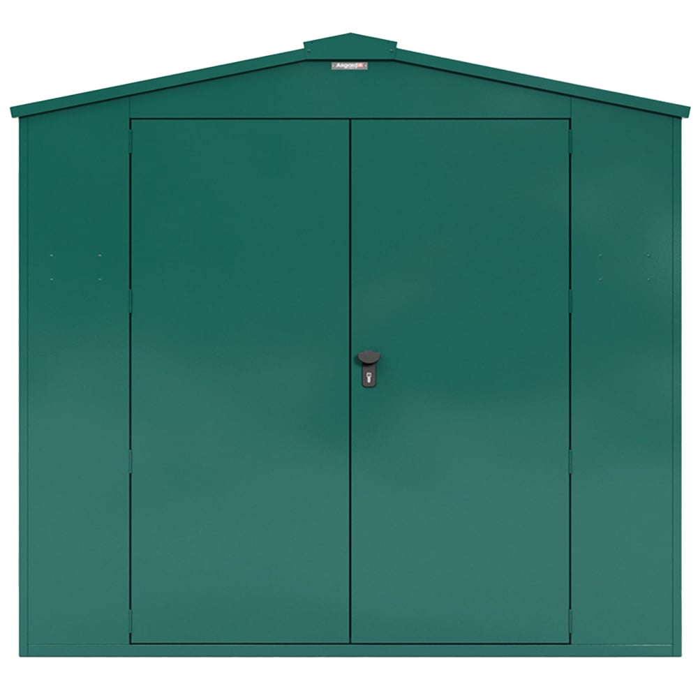 Store and keep your garden equipment safe with this Asgard Gladiator Double Door High Security Apex Garden Shed. It is a 100% British-made, Secured by Design (Police Preferred Specification), Locksmith and Insurance-Approved secure multi-purpose shed, providing exceptionally secure storage for all of your bikes and garden equipment. With a compact footprint, this shed features pick and drill-resistant locks with a snap-off, theft-resistant handle, a five-point locking system including deadbolts, reinforced doors, stainless steel hinges, and heavy-duty steel panels. This fully approved shed offers superior, professional-level security and is the ideal (one-stop) secure store for all tools and garden equipment. The shed is extra wide, to accommodate side-mounted shelves, is constructed from thick, weatherproof galvanised steel panels and features an integral metal floor and convenient large double door access. Fitted with internal electrical mounting plates (for adding your own power sockets), this heavy-duty shed is ideal for storing and powering up your garden tools all year round. This fully ventilated all-metal storage shed has been designed to minimise condensation thanks to the integral ventilation system, helping to maintain internal airflow, while remaining secure. Helping to keep tools not just safe but also dry. Dimensions: 7 x 18ft. The base size recommended is 2410mm x 3790mm - (Internal Measurements are 1980mm apex / 1820mm eaves x D5408mm x W2140mm). Colour: Green. Note: The shed must sit on concrete, tarmac or concrete. Hardcore, soil, grass or eco bases are not suitable. The listing is for the unit only - any accessories shown are for illustration purposes only.