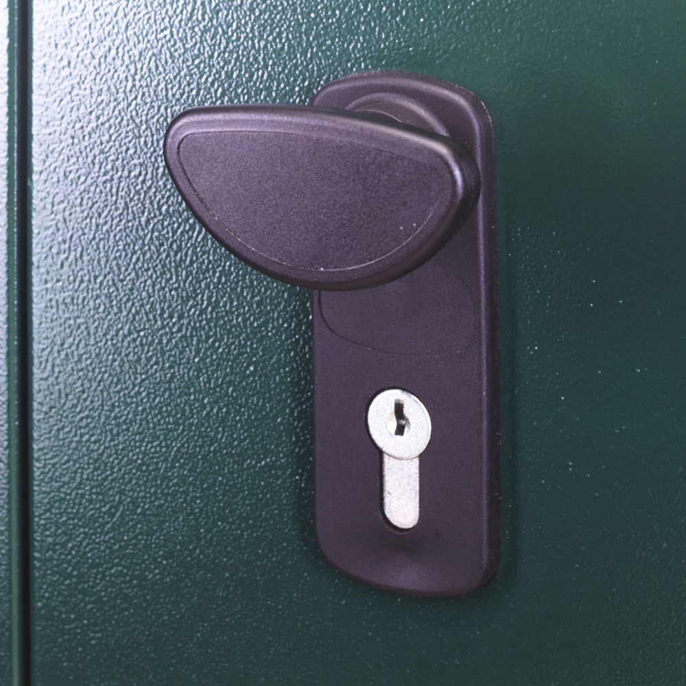 Keep your garden gear safe, dry, and ready to go with the Asgard Secure Store Double Door Green Garden Shed 5 x 3ft. Featuring solid, all-metal construction, this garden shed is built to keep everything neatly stored. It is made with thick, weatherproof, galvanised steel panels, a full metal floor, and stainless-steel hinges for extra strength. The large double doors make it easy to move equipment in and out without squeezing or juggling. Security is top-level too. The three-point deadbolt locking system, combined with pick and drill resistant locks, keeps your tools safe from unwanted hands. Inside, built-in ventilation keeps air moving and helps stop condensation, so your gear stays dry, even through winter. Please note that this listing is for the unit only. Accessories shown in the picture are not included; they are just for illustration. You must place this shed on a solid surface like concrete or tarmac. It’s not suitable for grass, soil, hardore, or eco bases. The base size recommended is 1600 x 1000mm. Internal measurements: 1260mm (back height) / 1250mm (front height) x 840mm (depth) x 1435mm (width).